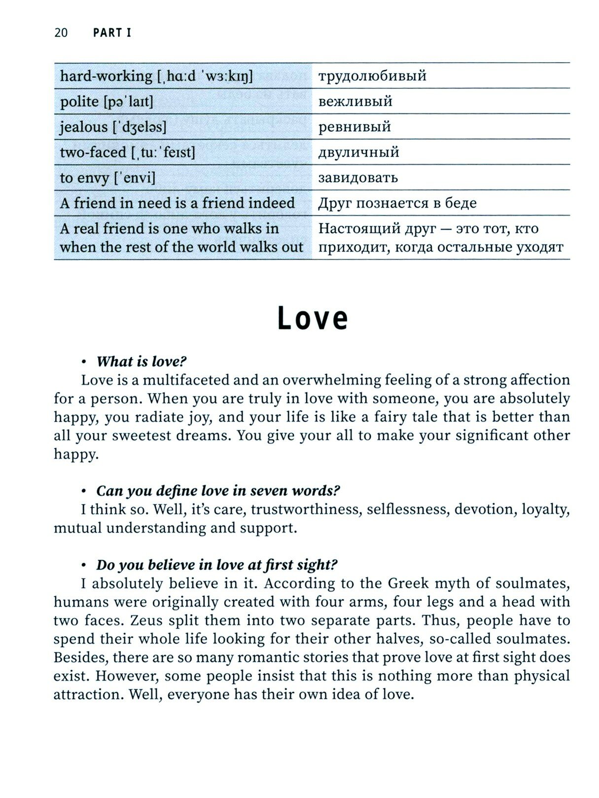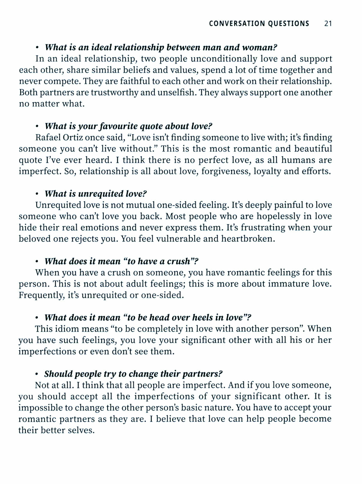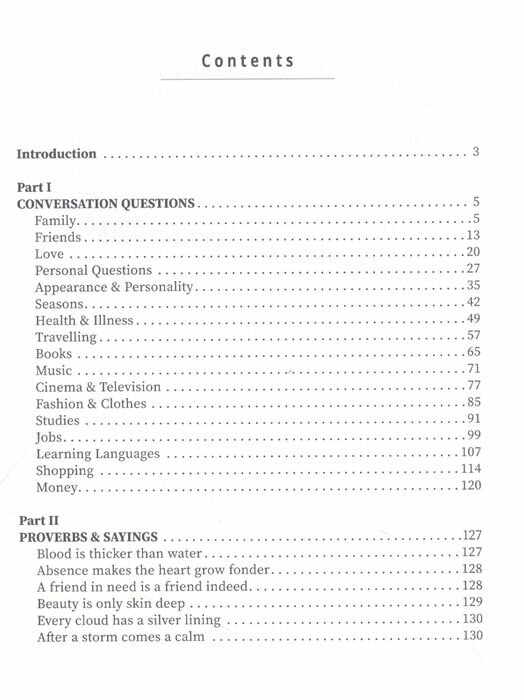 Книга состоит из двух разделов: "Вопросы для обсуждения" (Conversation Questions) и "Пословицы и поговорки" (Proverbs & Sayings). Для более эффективного освоения материала после каждого раздела представлен базовый тематический словарь (Topical Vocabulary). В книге рассмотрены самые актуальные темы, такие как "Семья", "Друзья", "Работа", "Любовь", "Здоровье", "Покупки", "Мода", "Путешествия" и другие.