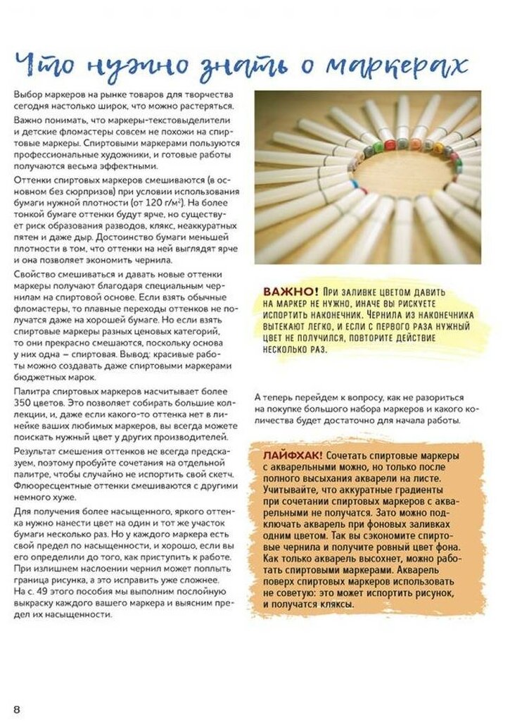 Представляем пособие по рисованию спиртовыми маркерами для начинающих! Это издание уникально тем, что представляет собой подробный самоучитель и рабочий скетчбук под одной обложкой. Структура пособия продумана таким образом, чтобы те, кто впервые взял маркер в руки, могли с легкостью освоить эту технику, а уверенные пользователи - восполнить пробелы в знаниях и узнать новые лайфхаки. Практическая часть пособия включает 17 несложных уроков с подробными инструкциями, которые заменяют занятия с преподавателем. Построенный от простого к сложному, каждый урок поможет вам усвоить теорию, чтобы затем отработать ее на практике. Помимо приемов работы с маркерами, вы узнаете, как пользоваться размерной сеткой, пример которой также можно найти в пособии. В практической части вы сможете отработать отдельные навыки, представленные в теоретической части, и нарисовать по шагам полноценные скетчи с нуля. Для вашего удобства практическая часть пособия напечатана на листах более плотной офсетной бумаги (160 г/м2), а скрепление на пружину поможет вам с легкостью раскрывать пособие на любой нужной вам странице и, при желании, отделяя листы для практики, работать, держа теоретическую часть всегда перед глазами.