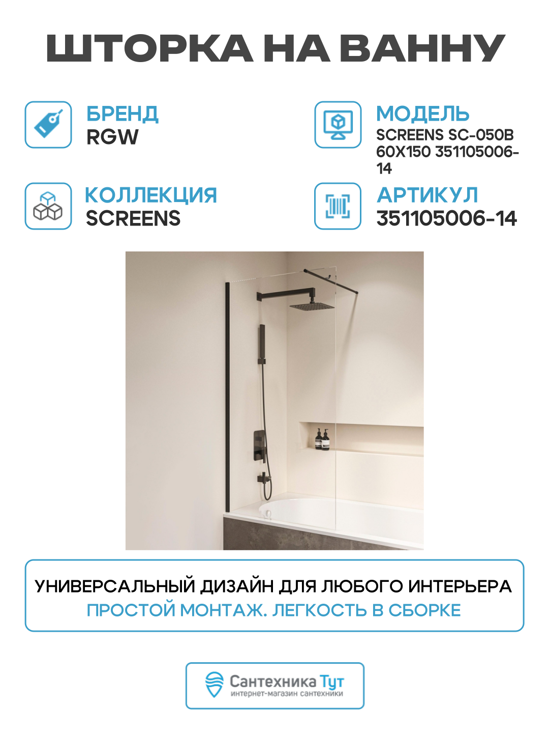 На сегодняшний день товар «Шторка на ванну RGW Screens SC-050B 60x150 351105006-14 профиль Черный стекло прозрачное» можно купить с кешбеком в 3 магазинах: Santehnika-room, Сантехника Тут, dushevoi