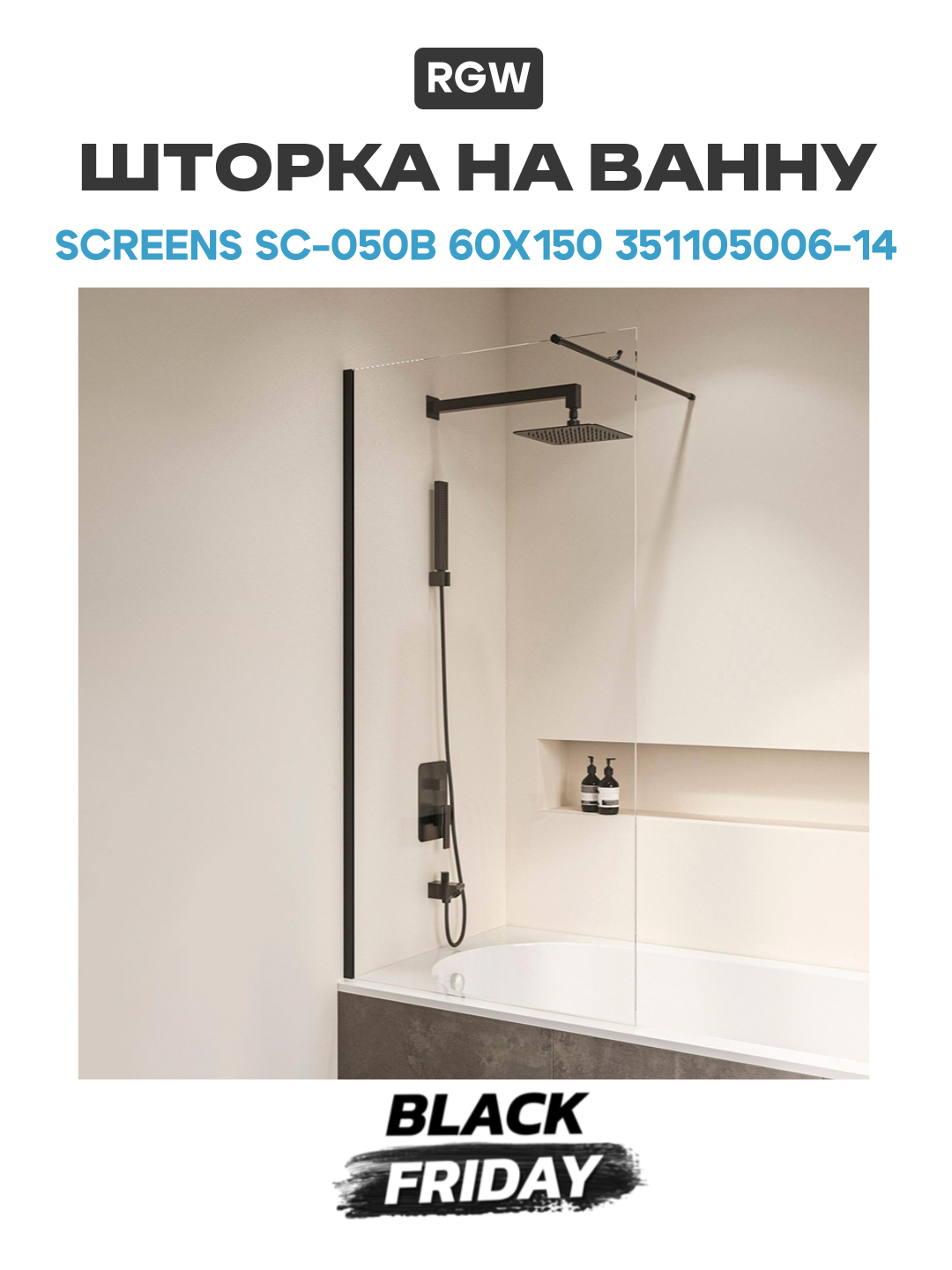 Шторка на ванну RGW Screens SC-050B 60x150 351105006-14 профиль Черный стекло прозрачное