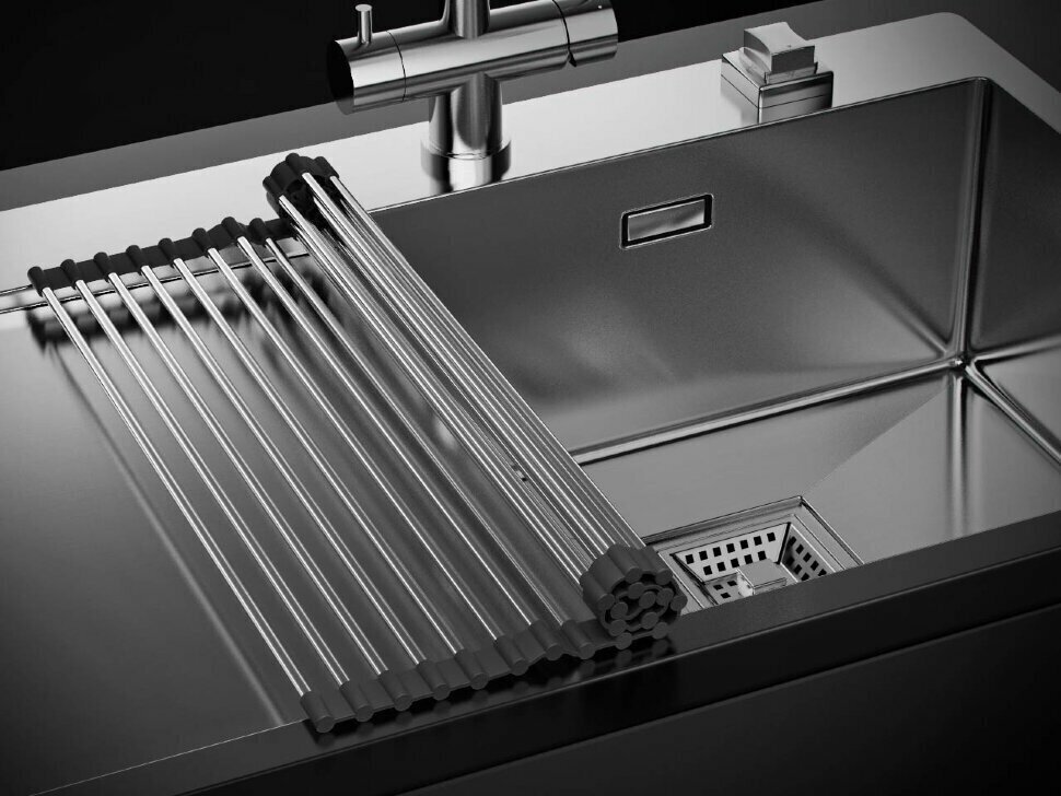Ролл-Мат для мойки Omoikiri ROLL-01-Silicone-BL 4997006. Материал: нержавеющая сталь, черный силикон. Цвет: черный силикон. Параметры: 425x350 мм. Подходят для моек с шириной чаши до 420 мм. Стильные коврики расстилаются на крыле мойки или на столешнице. Можно использовать для размещения горячих кастрюль и сковородок. Легко сворачивается в компактный рулон и занимает мало места при хранении.