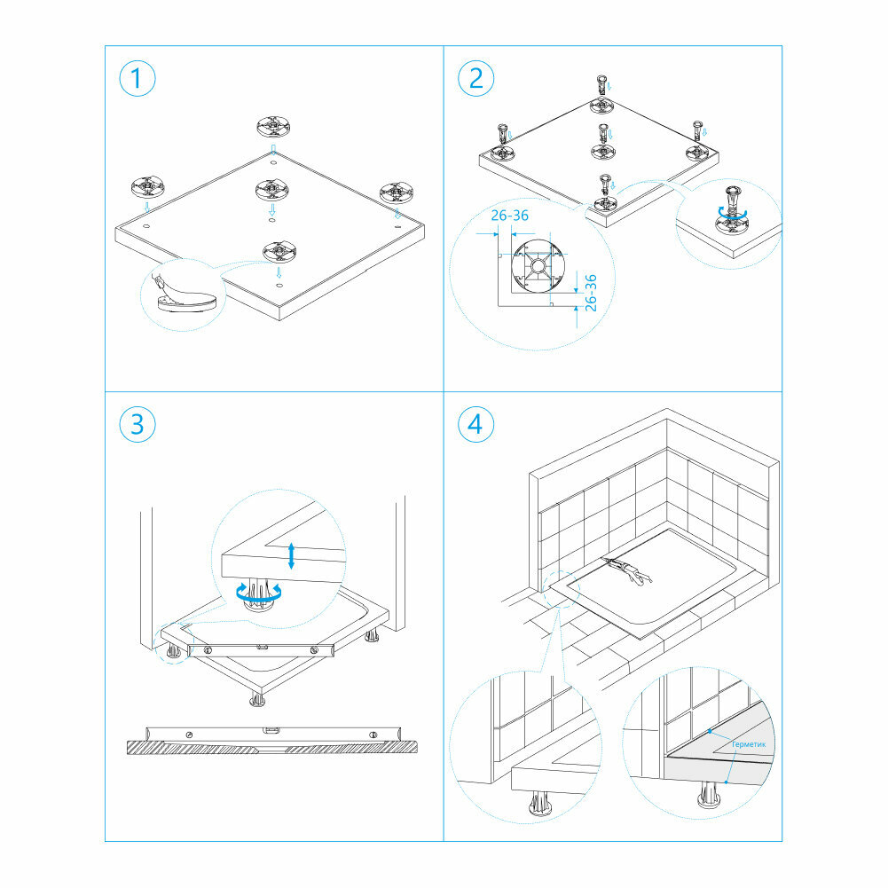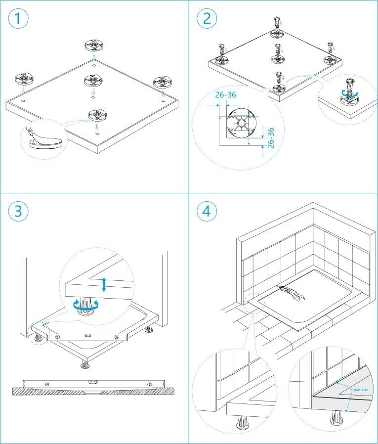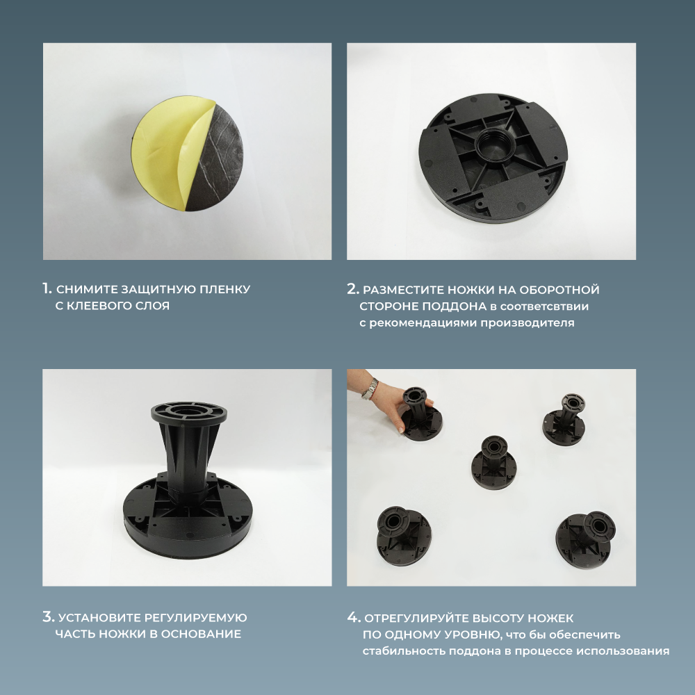 Ножки для поддона - это простое и универсальное решение для монтажа душевых поддонов из искусственного камня и литьевого мрамора, а также они идеально подходят в качестве опорной конструкции для мебели: шкафы, тумбы, стеллажи для хранения и т.д.