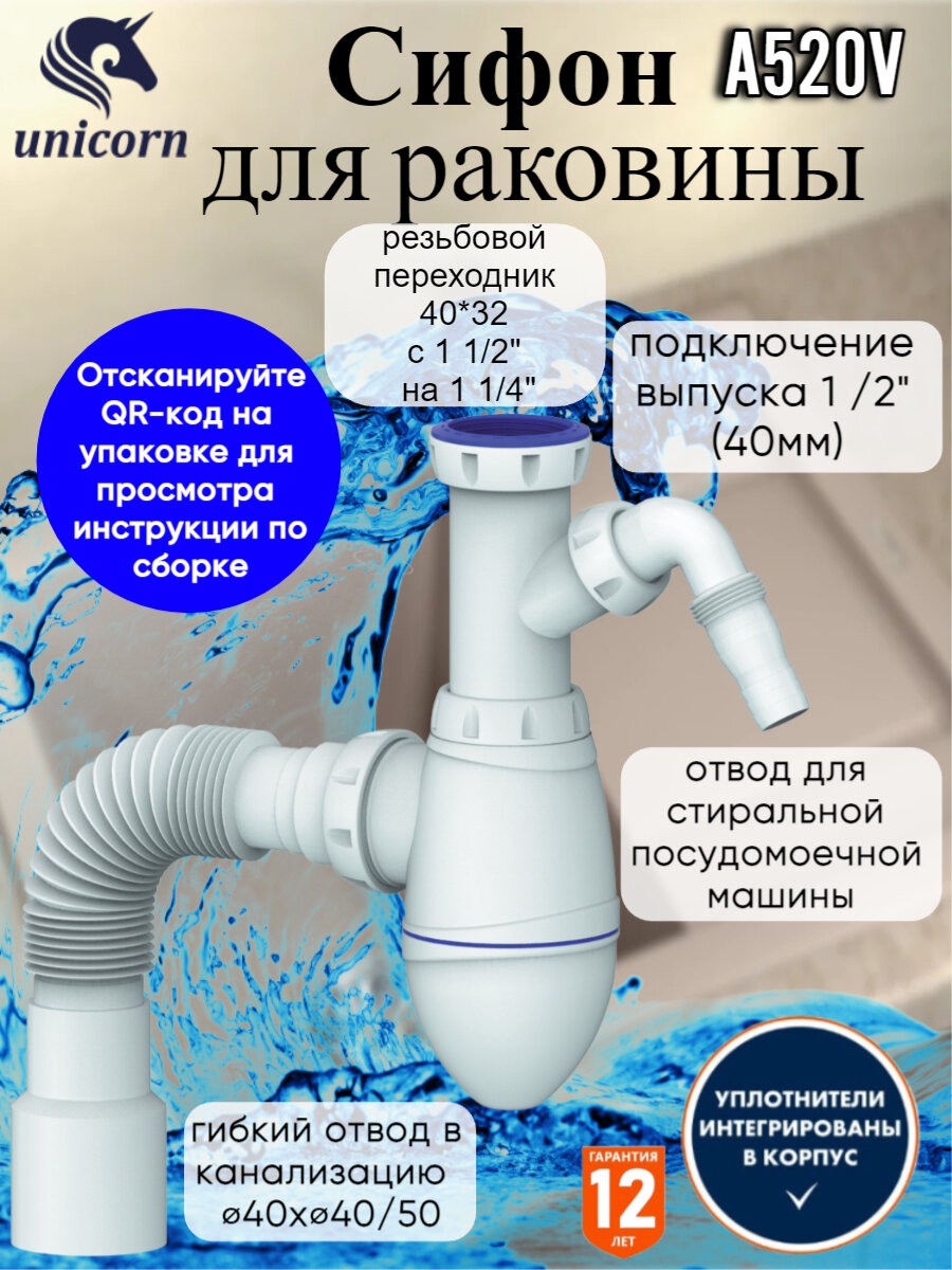 Сифон для раковины Unicorn с переходником 40х32 мм и отводом для стиральной машины A520V