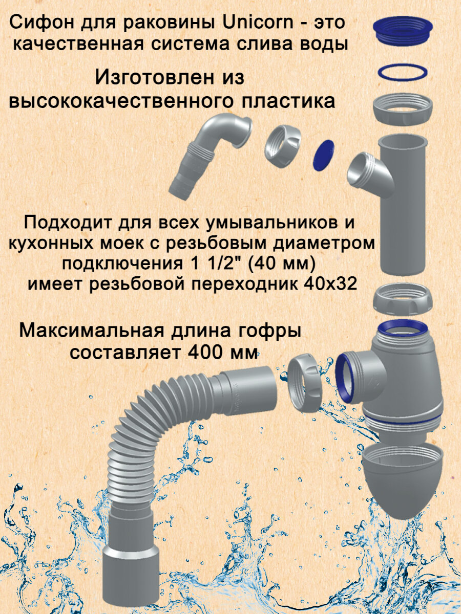 Сервис сравнения цен СкидкаГИД предлагает сравнить цены на товар «Сифон для раковины Unicorn с переходником 40х32 мм и отводом для стиральной машины A520V»