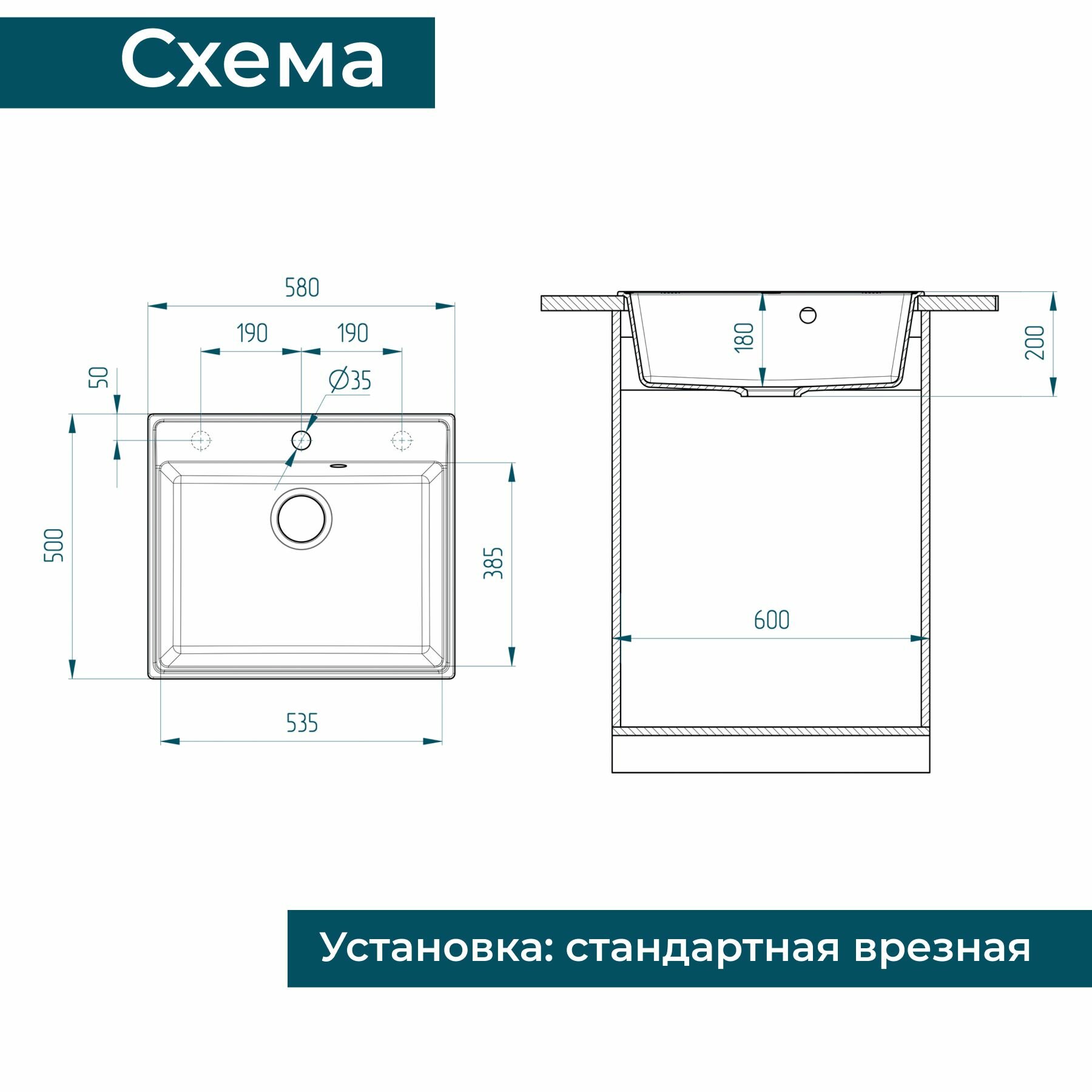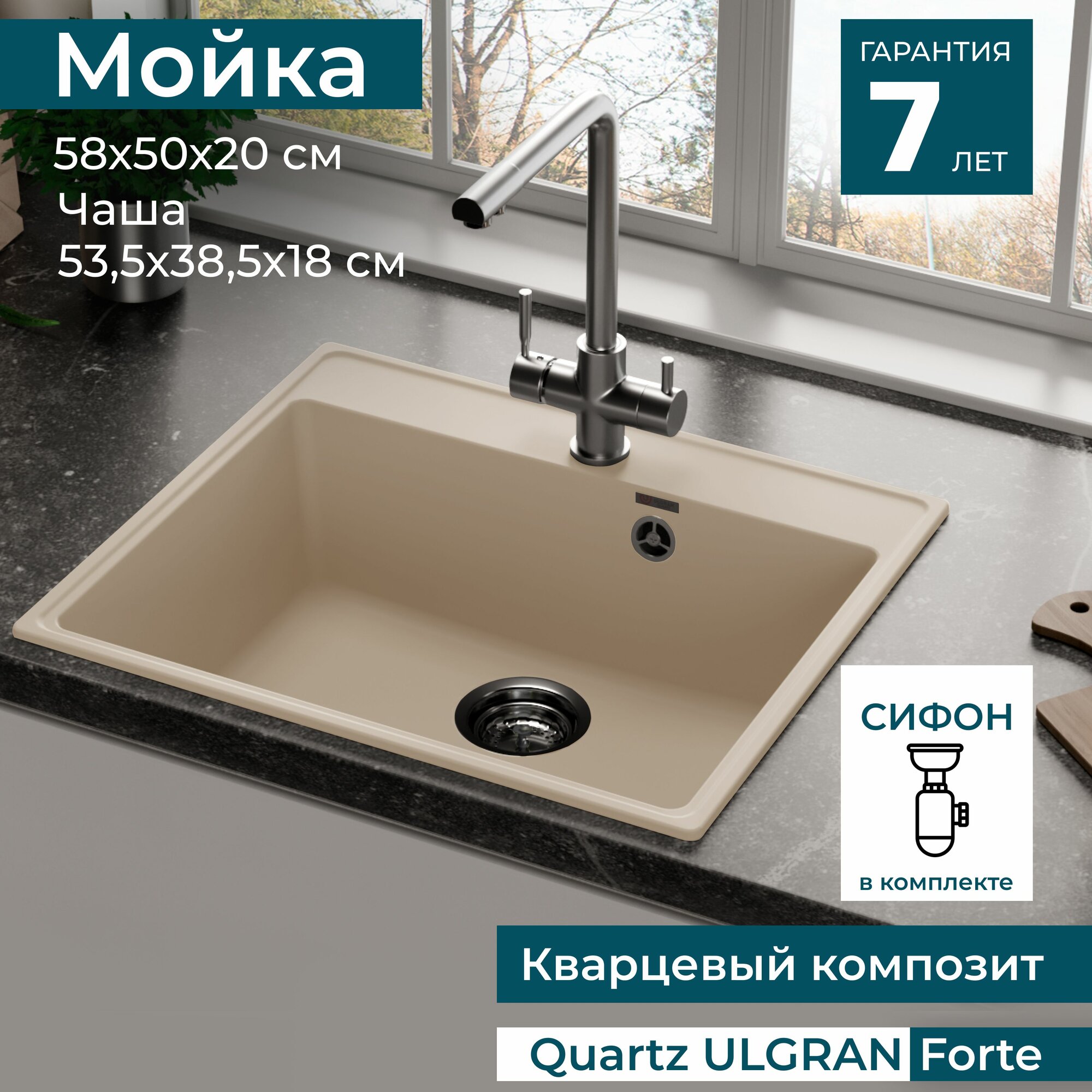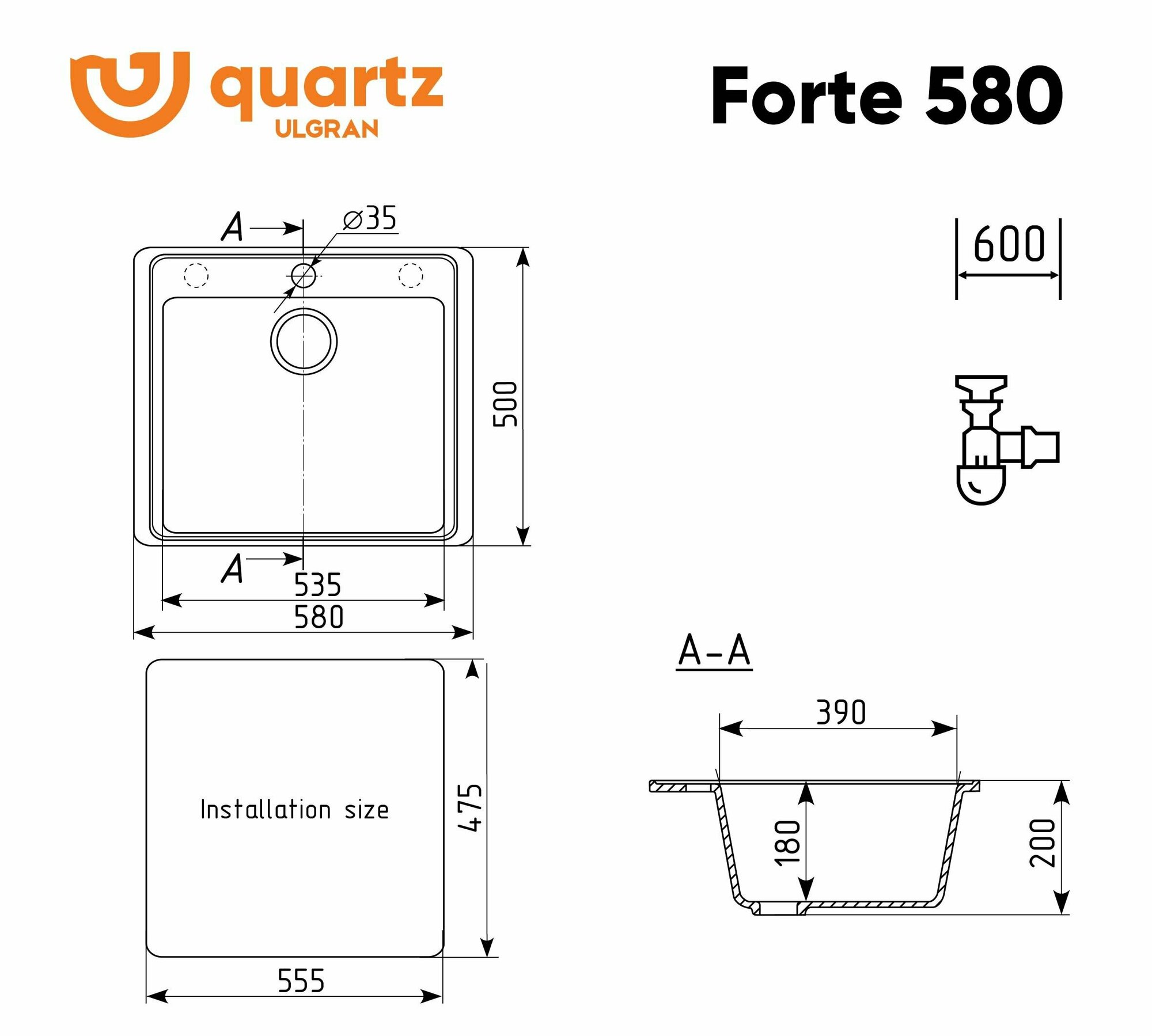 ULGRAN Quartz Forte 580 - квадратная кухонная мойка с увеличенной чашей, изготовленная на современном автоматизированном оборудовании из высококачественных кварцевых композитов по инжекционной технологии (литье под давлением). Кварцевый композит является поистине инновационным материалом в производстве кухонных моек! Он сочетает в себе такие неоспоримые преимущества как повышенная влагостойкость и термостойкость, возможность придать мойке при изготовлении практичный и функциональный дизайн, увеличенное сопротивление внешнему износу, снижение уровня шума при падении струи воды, безусловная гигиеничность и простота в уходе, а также сравнительно малый вес при высокой прочности. Мойка является односекционной, с отверстием под смеситель, при этом существуют 2 дополнительно намеченных отверстия под аксессуары (дозатор или клапан-автомат). Мойка устанавливается в кухонный шкаф шириной от 60 см. Данная мойка имеет современный эргономичный дизайн и очень практична, так как в ней легко мыть крупногабаритные предметы. В комплектацию входит сливная арматура серии "Элит" с гофротрубой, технический паспорт и гарантийный талон. Заводская гарантия составляет 5 лет, а срок службы данной мойки, при соблюдении основных правил ухода за ней, составляет более 20 лет.