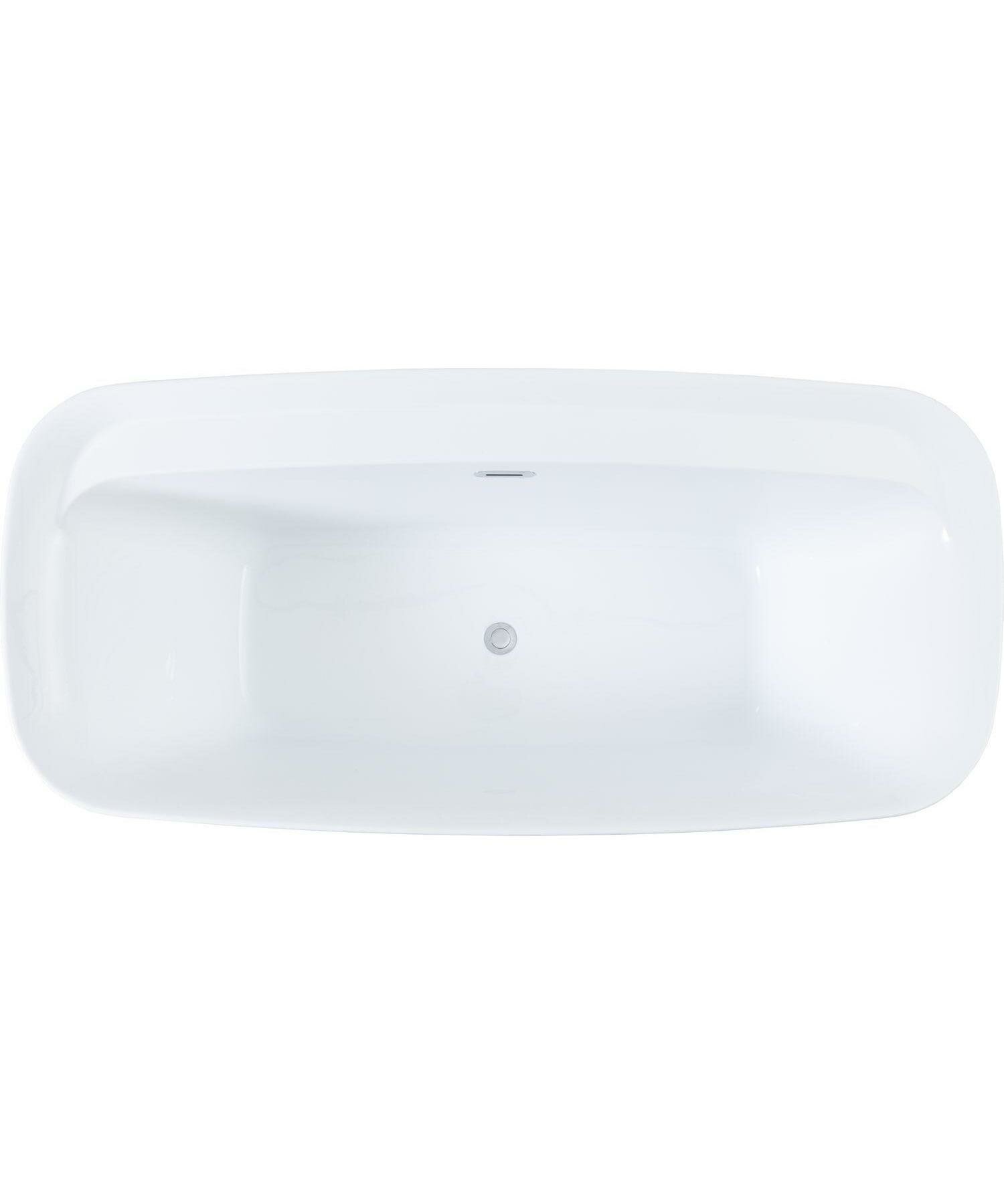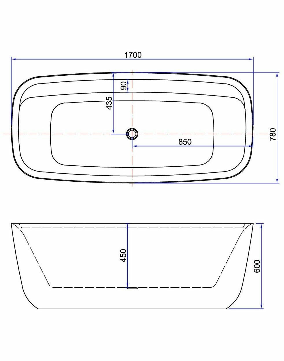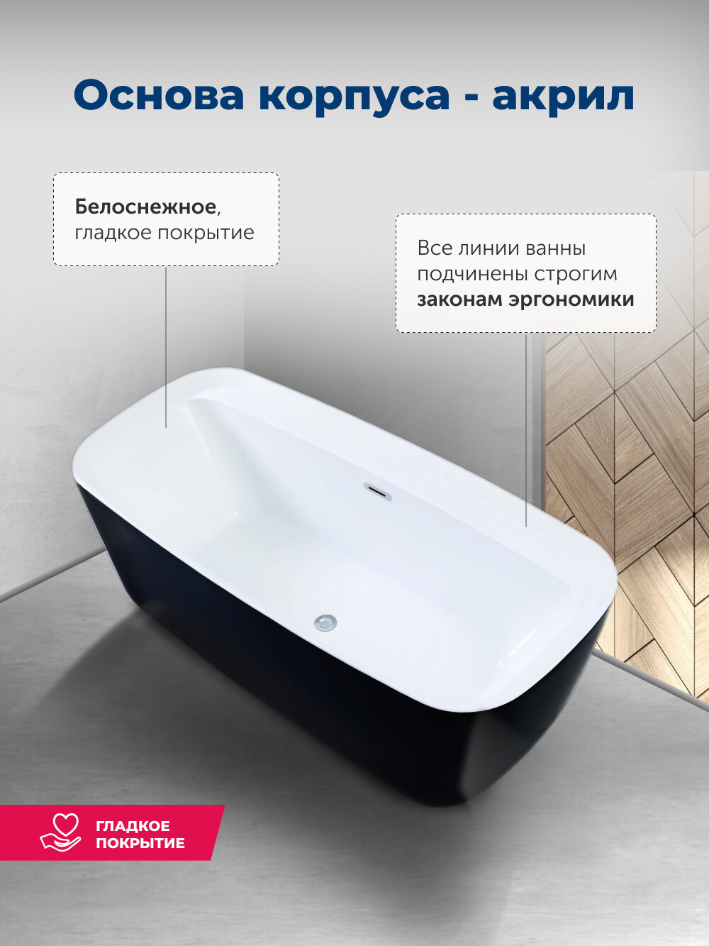 С одной стороны встроен широкий бортик, на котором удобно хранить гигиенические и банные принадлежности. В центральной части дна есть отверстие для слива. Модель устанавливают вдоль стены или в удобном месте ванной комнаты, а смеситель крепят к стене или полу. Для изготовления корпуса использован акрил — прочный, хорошо удерживающий тепло и легко очищающийся от загрязнений материал. Габариты — 170х78х60 см. Ножки для монтажа и слив-перелив входят в комплект поставки.