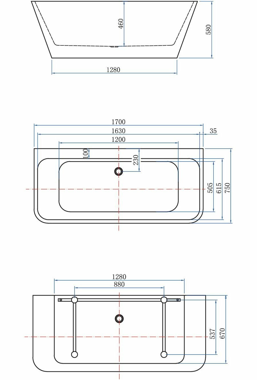 Длина составляет 170 см, ширина — 75 см. При стандартных размерах и глубине 46 см чаша вмещает 250 л воды. Пологая спинка позволит расположиться с комфортом и расслабить мышцы тела и шеи. Перелив размещен практически у самого бортика. Широкая кромка обеспечивает свободный доступ к подготовленным к принятию процедур уходовым средствам и банным принадлежностям. Встроенный по центру слив позволяет дотянуться к нему с любой стороны ванны. Модель не подходит для установки гидромассажных систем, хромотерапии.