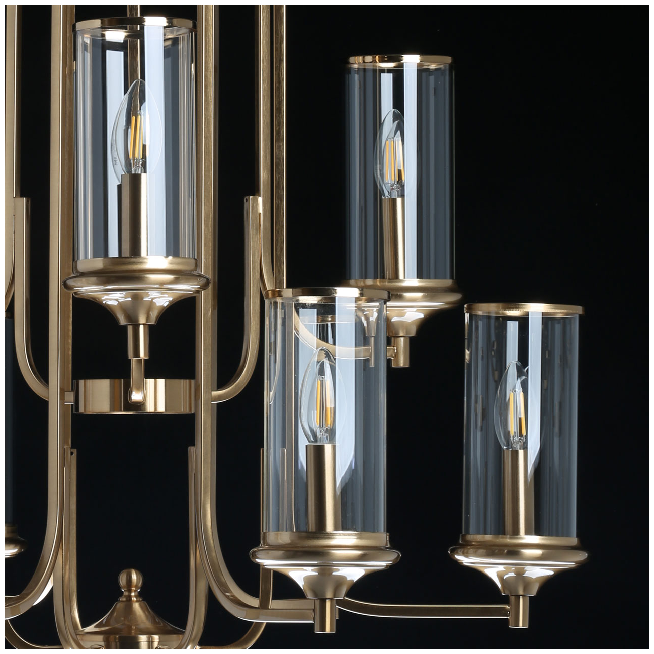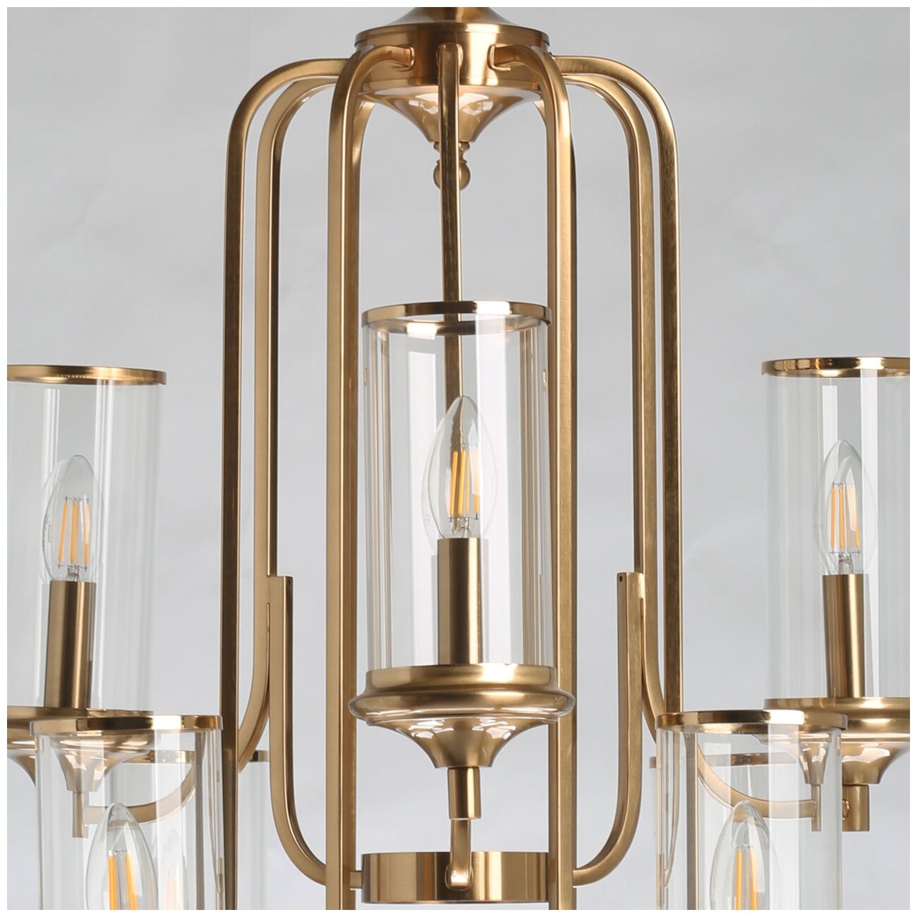 Металлическое основание светильника гальванизировано в цвет бронзы. Светильник декорирован прозрачными стеклянными плафонами цилиндрической формы.