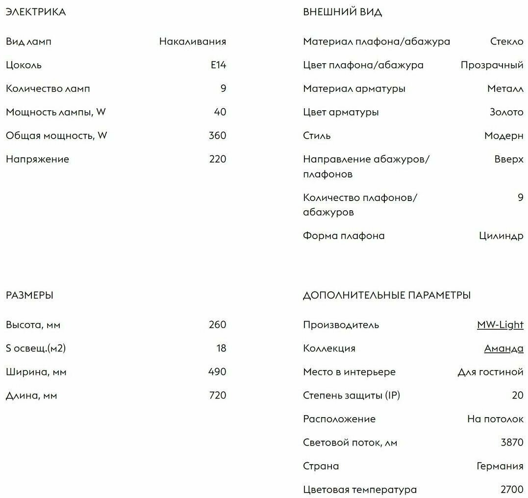 | Комплектация | светильник без лампочек в комплекте |