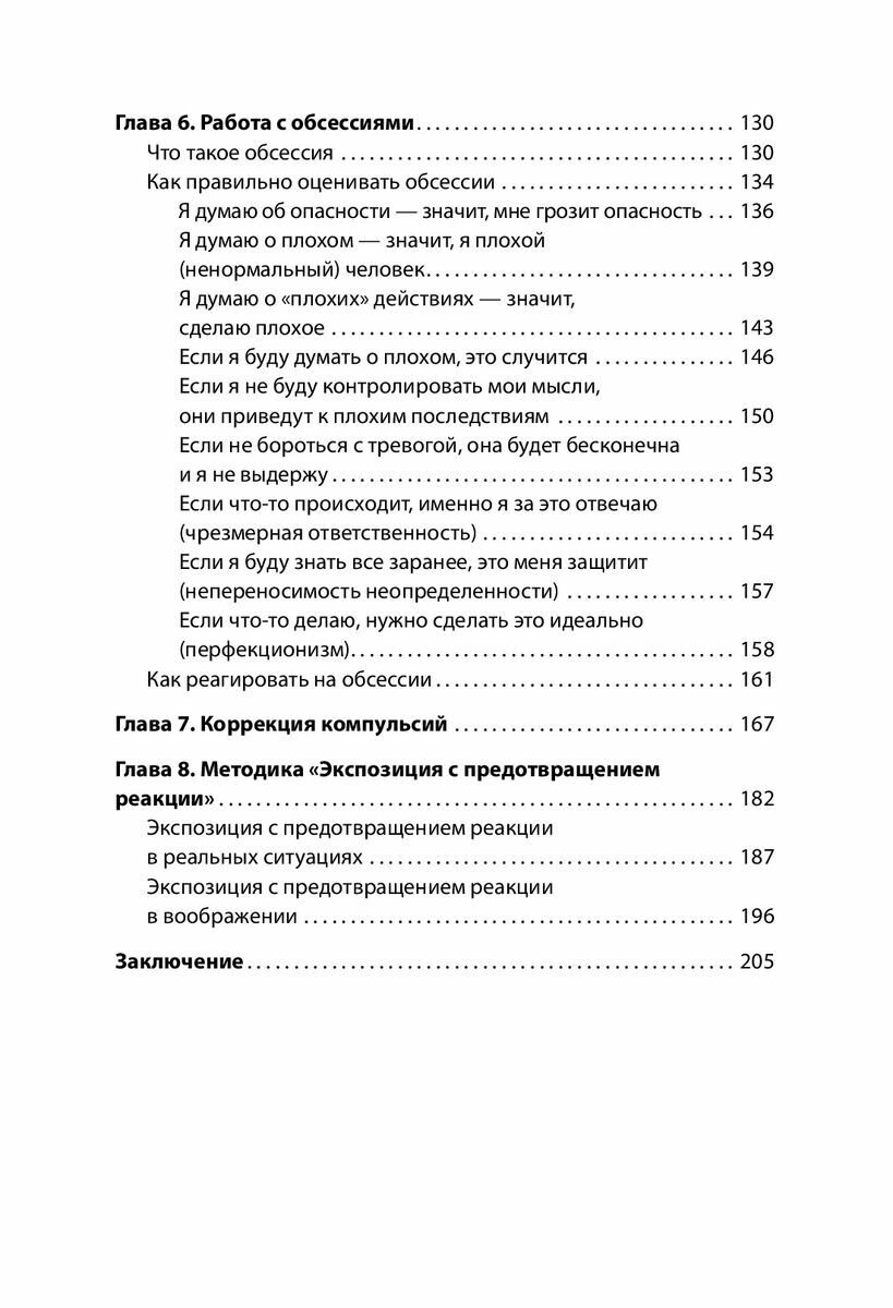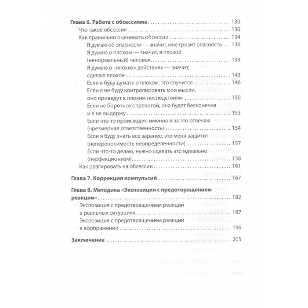 Именно то, что я увлеклась психологией, пусть и через книги популярной психологии, в итоге дало мне название моим навязчивым состояниям - ОКР. Это было со мной еще в детстве, как я могу сейчас это оценить. Родители не сильны в психологии и терминах, поэтому я просто была проблемным и капризным ребенком, чересчур чистоплотным и "дотошным". Сейчас все легче, намного. Я выросла и больше нет выраженной требовательности гипер чистоты, мытья в душе по часу и больше, идеально лежащих волос в хвосте или футболки без складок. Остались мысли. И опять же, я только недавно поняла, что это такое. Что если я подумала о плохом - это не значит, что теперь плохое со мной произойдет, и не нужно со страхом повторять "нет, нет, нет, я этого не хочу". Поэтому пробежавшись по книге, я остановилась именно на обсессиях, где почти каждая про меня. Так как это не первая книга на тему окр у меня, я уже знаю самые ходовые способы борьбы с симптомами, навязчивыми мыслями и тд. В данный момент это не мешает мне жить, так как физических проявлений, как в детстве, уже нет, а изучение материала и практика позволили мне научиться критически мыслить и разделять себя и свои навязчивые состояния. Однако для всех неспокойных, тревожных, чересчур пугливых, "дотошных" и замкнутых людей, я советую изучить первым делом именно этот материал - обсессивно-компульсивное расстройство. Так получилось, что многие убеждения касательно именно мыслей я слышала еще в детстве, как.. приметы? Я не знаю, как это называется. Но не думать о плохом, никогда не говорить "никогда" и еще много чего, что имело место быть в простонародье, я думаю, взрастили во мне окр, и думаю, что не у меня одной. Данная книга показалась мне более бытовой и применимой. Автор разбирает проявление окр в отношениях, окр, которое как раз выражается в навязчивости чистоты и порядка, окр накопительство, окр как повторяющиеся действия, наверное, самое распространенное, что люди знают о расстройстве, и, конечно, обсессии, которых тоже огромное количество.