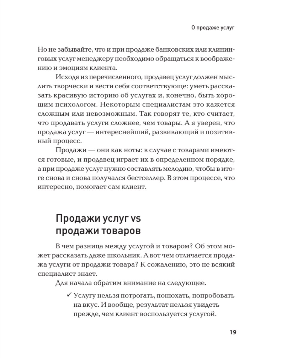 1) Книгу написал российский эксперт - практик. Хорошо структурированная информация, которая максимально раскрывает тему и проверена в деле. Без воды, четко и по делу написано об: активных продажах услуг, холодных звонках и работе с возражениями. А еще главы с презентациями, переговорами, маркетингом,сервисом и многим другим.