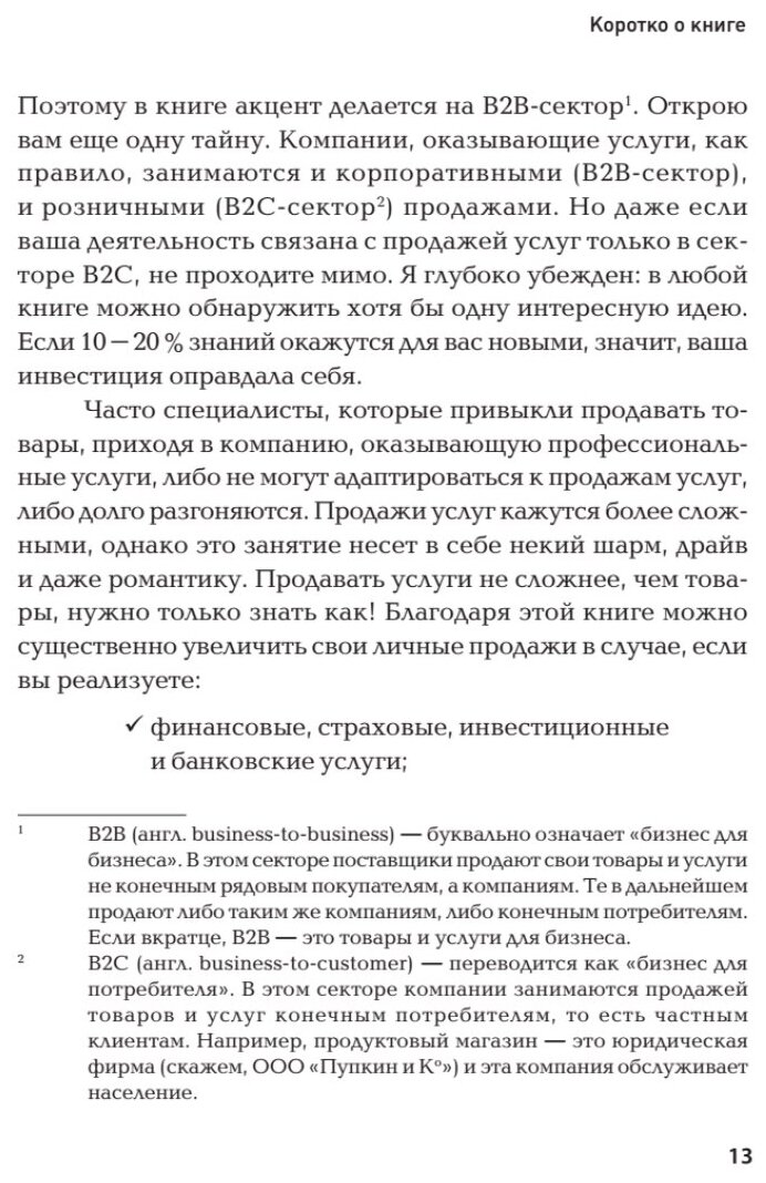 1) К сожалению, книга больше про продаж услуг корпоративным клиентам. Об этом говорится внутри книги, но нигде снаружи. Если быть честным, то для продаж в секторе b2с книга будет полезна. Только менее.