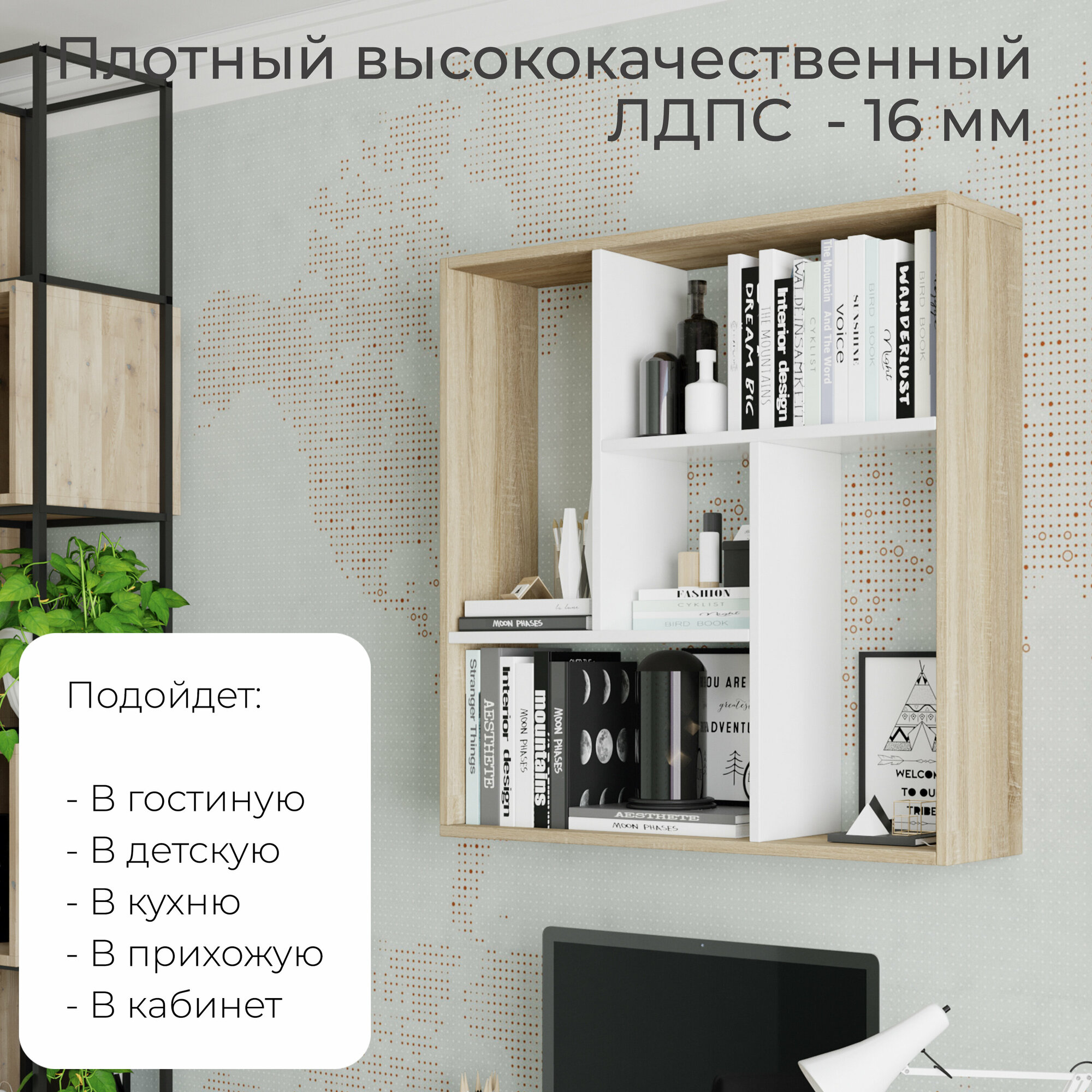 Геометричная универсальная полка представленная в современном дизайне и цвете, предназначенная для книг и других аксессуаров, которая подойдет в цвета любого интерьера. Настенная полка тип 16 подойдет для любых помещений: малогабаритных квартир и больших апартаментов. Полка универсальная и ее можно использовать на кухне для специй или посуды, в гостиной и спальне в качестве книжной полки, в кабинете для хранения документов или школьных принадлежностей. Полка изготовлена из прочного ЛДСП высокого качества. Полочка поможет вам организовать рабочее пространство и позволит хранить нужные вещи в быстром доступе. Все отверстия данной модели мебели сделаны на производстве, поставляется в разобранном виде, вся фурнитура и инструкция идет в комплекте. Книжная полка имеет быструю и легкую сборку.Прежде чем приступить к сборке, необходимо убедиться в качестве, количестве и соответствии всех деталей. Если таковые выявлены, необходимо незамедлительно связаться с площадкой и продавцом, для разрешения вопроса, не приступая к сборке.Товар после сборки возврату и обмену не подлежит.