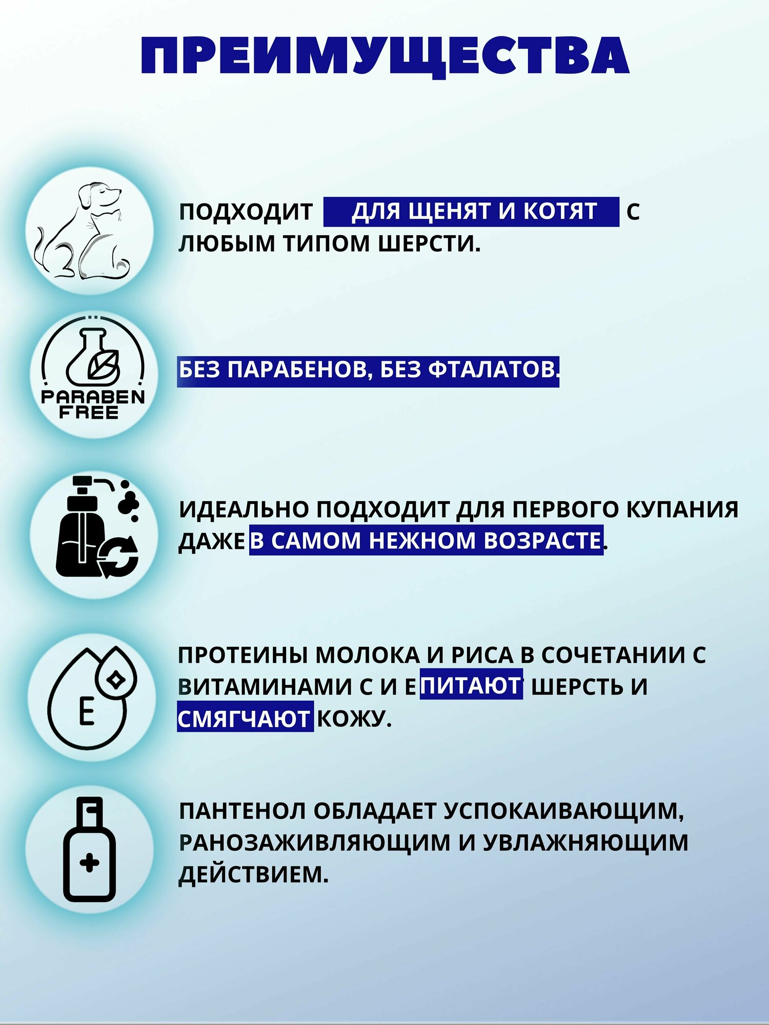 Шампунь разработан специально для самых юных питомцев. Идеально подходит для первого купания даже в самом нежном возрасте. Рассчитан на любой тип шерсти.