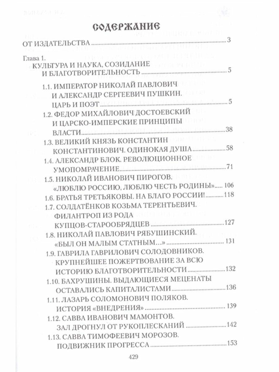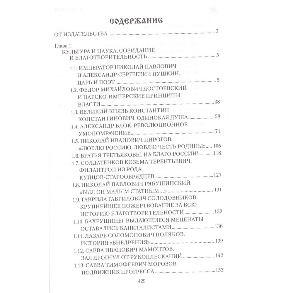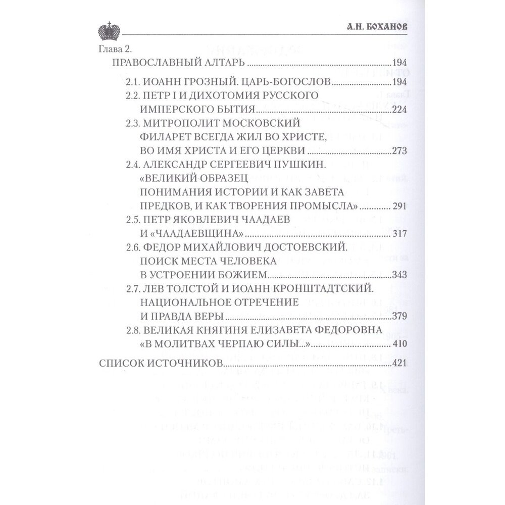 Героями книги выдающегося русского историка Александра Боханова стали истинные патриоты нашего Отчества - люди, бескорыстно и жертвенно любившие свою страну, чей подвиг беззаветного служения России способствовал ее тысячелетнему созиданию и процветанию, ее беспрецедентному величию и могуществу. Среди них представители русского мира, самоотверженно любившие свою страну и работавшие ради ее блага: предприниматели (С.И. Мамонтов, К.Т. Солдатенков, Л.С. Поляков, С.Т. Морозов), деятели культуры (А.С. Пушкин, Ф.М. Достоевский, А.А. Блок), деятели Русской Православной церкви (Святитель Московский Филарет и Иоанн Кронштадтский). Многие из представленных героев стали символами различных эпох; жизнь каждого из них драматична, противоречива, но верность нравственным ценностям, избранным ими раз и навсегда, помогала выстоять и озарить "ярким светом и саму личность, и Отечество".