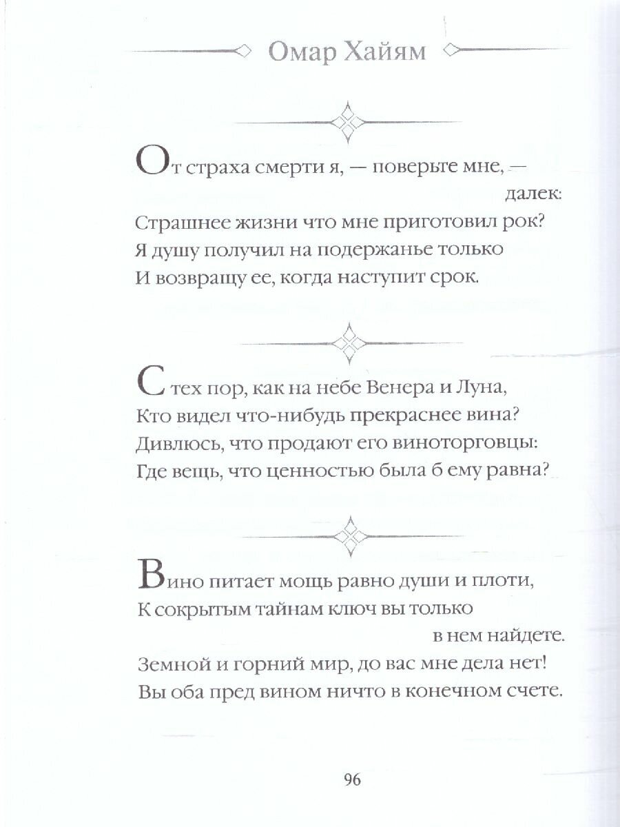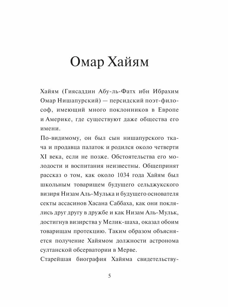 Персидский мудрец, астроном, математик, физик и философ, Омар Хайям (ок. 1048–1131) — автор знаменитых рубаи, которые прославляют любовь и красоту, жизнь во всех ее проявлениях. В книгу вошли лучшие афоризмы великого поэта в классических переводах, отличающиеся выразительной сжатостью и художественностью, глубоким элегическим чувством, иногда метким, насмешливым остроумием. До сих пор любимые как на Востоке, так и на Западе, эти четверостишия дают силы в трудную минуту и предлагают читателю наполненный глубоким смыслом и непреходящей мудростью взгляд на мир.