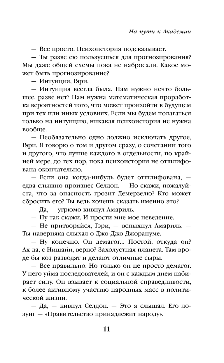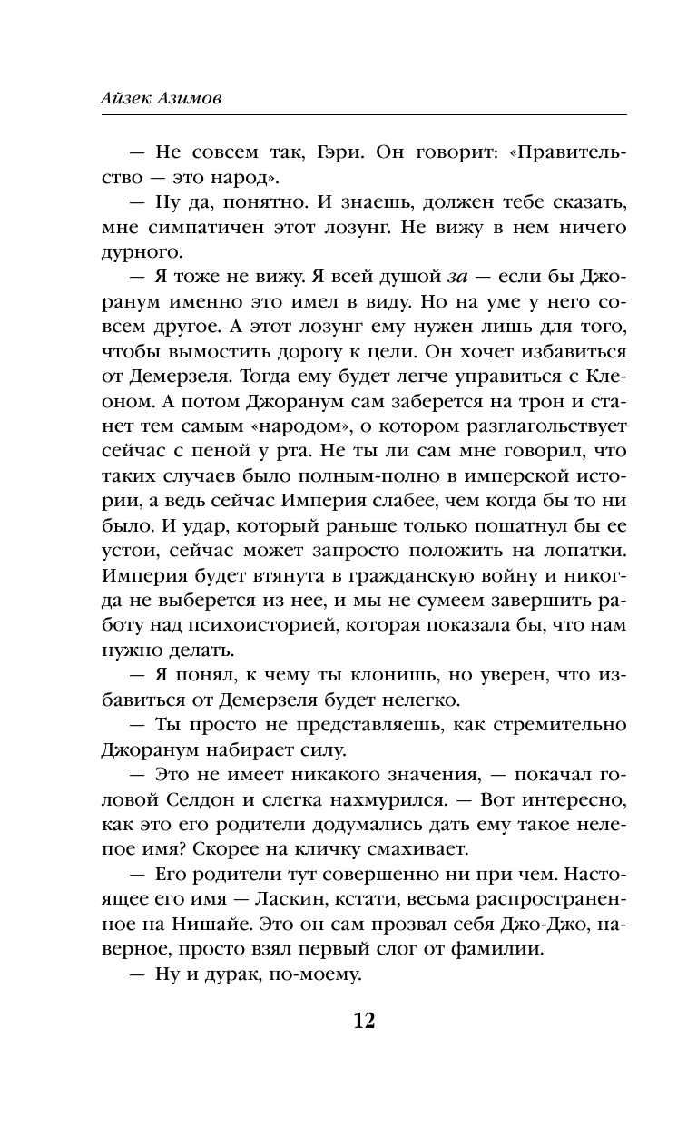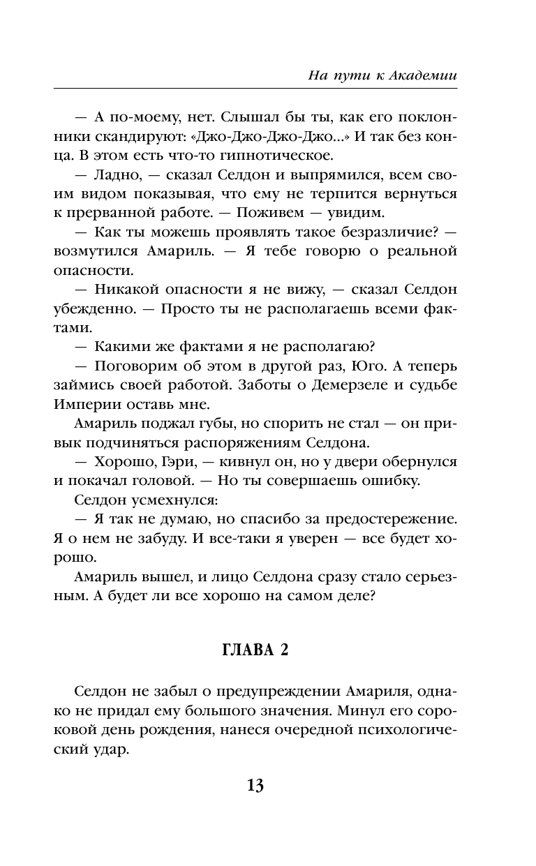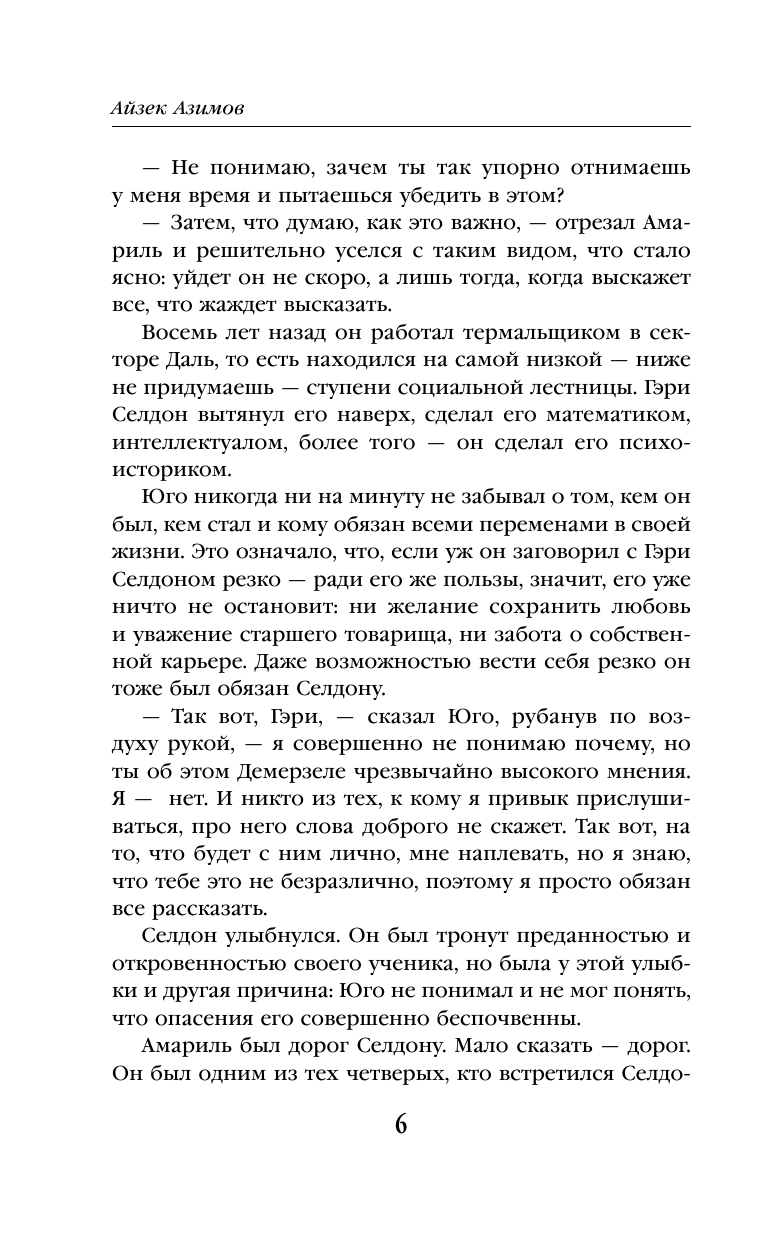 Это второй том фантастической эпопеи "Академия". Стилистически отличный от первого тома меньшей динамикой сюжета, зато более наполнен размышлениями о судьбе: "Быть или не быть", что хорошо, а что плохо, жертва одного человека во благо человечества... Это последний написанный А.Азимовым роман, и потому в нем ярко прослеживается идея: как краток человеческий век на фоне галактической эволюции. Гарри Селдон понимает, что ему и паре его верных соратников нужна Академия, чтобы спасти человечество от хаоса, когда падет Галактическая Империя