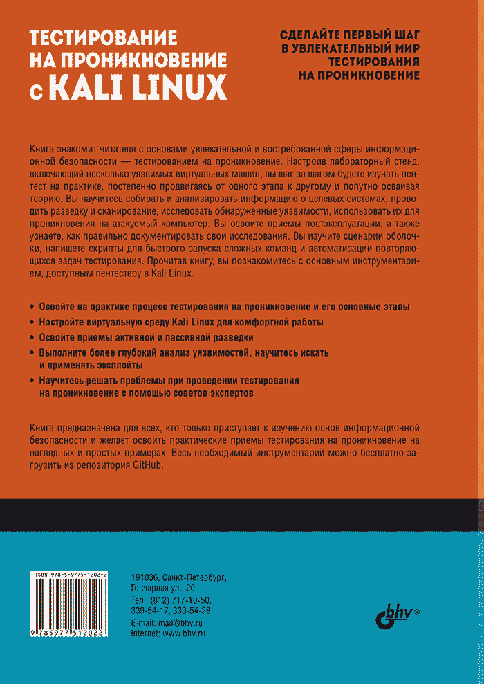 Подробно рассмотрен процесс тестирования на проникновение, его виды, этапы, юридический и практический аспекты. Даны советы по согласованию плана тестирования, выбору инструментария. Рассказано о возможностях дистрибутива Kali Linux, его настройке, принципах работы с командной строкой, показаны примеры вызова различных команд и написания скриптов для автоматизации рутинных процессов. Описан процесс сборки виртуальной лаборатории для тестирования на проникновение. С использованием инструментов Kali Linux максимально подробно и последовательно описываются все этапы пентеста: сбор информации, разведка и сканирование, перечисление работающих в целевых системах сервисов и служб, обнаружение уязвимостей, поиск эксплойтов, эксплуатация и постэксплуатация. Отдельный раздел посвящен правильному оформлению отчета о тестировании на проникновение и сопроводительной документации.