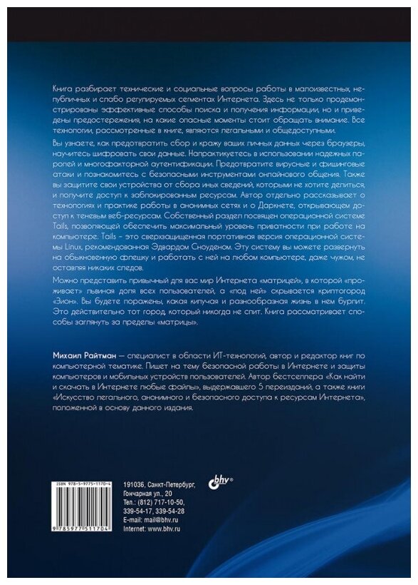 Книга о безопасной работе в Интернете и защите персональных данных, в том числе с соблюдением мер анонимизации и приватности. Рассматриваются вопросы выбора надежных паролей, использования прокси-серверов, анонимных сетей и VPN, технологии шифрования и защищенного общения. Особое внимание уделено анонимной операционной системе Tails, рекомендуемой Эдвардом Сноуденом. Приведены способы конспиративного общения по защищенным каналам связи и подключения к анонимным сетям, таким как I2P RetroShare и др. Даются практические рекомендации по безопасной работе с торрентами, мессенджерами, файловыми архивами. Книга поможет разобраться в устройстве Даркнета и варезной Сцены. Отдельная глава посвящена луковой архитектуре и браузеру Тог. Особое внимание уделено кастомизации устанавливаемых программ.
