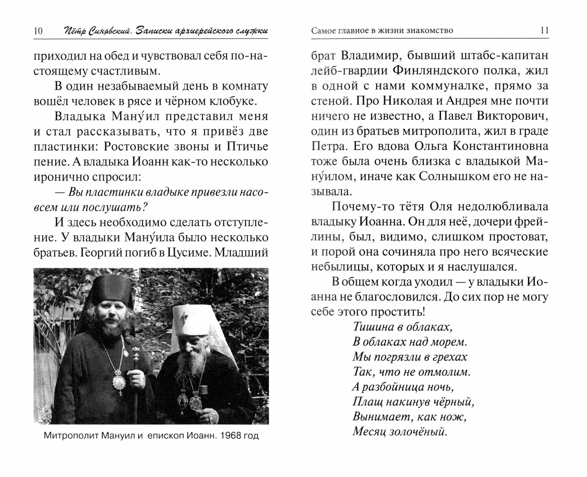 Петра Алексеевича Синявского хорошо знают дети и их родители. Потому что он — прежде всего детский поэт. Но мало кому известно, что, будучи внучатым племянником митрополита Мануила (Лемешевского), он также был духовным чадом приснопамятного митрополита Иоанна (Снычёва, † 2 ноября 1995 года). Сам владыка называл его своим служкой, поэтому Пётр Алексеевич так и озаглавил свою книгу — «Записки архиерейского служки». В них — неизбывная любовь к архипастырю, щемящая боль за его физические немощи и свои собственные промахи и — немножко поэзии...