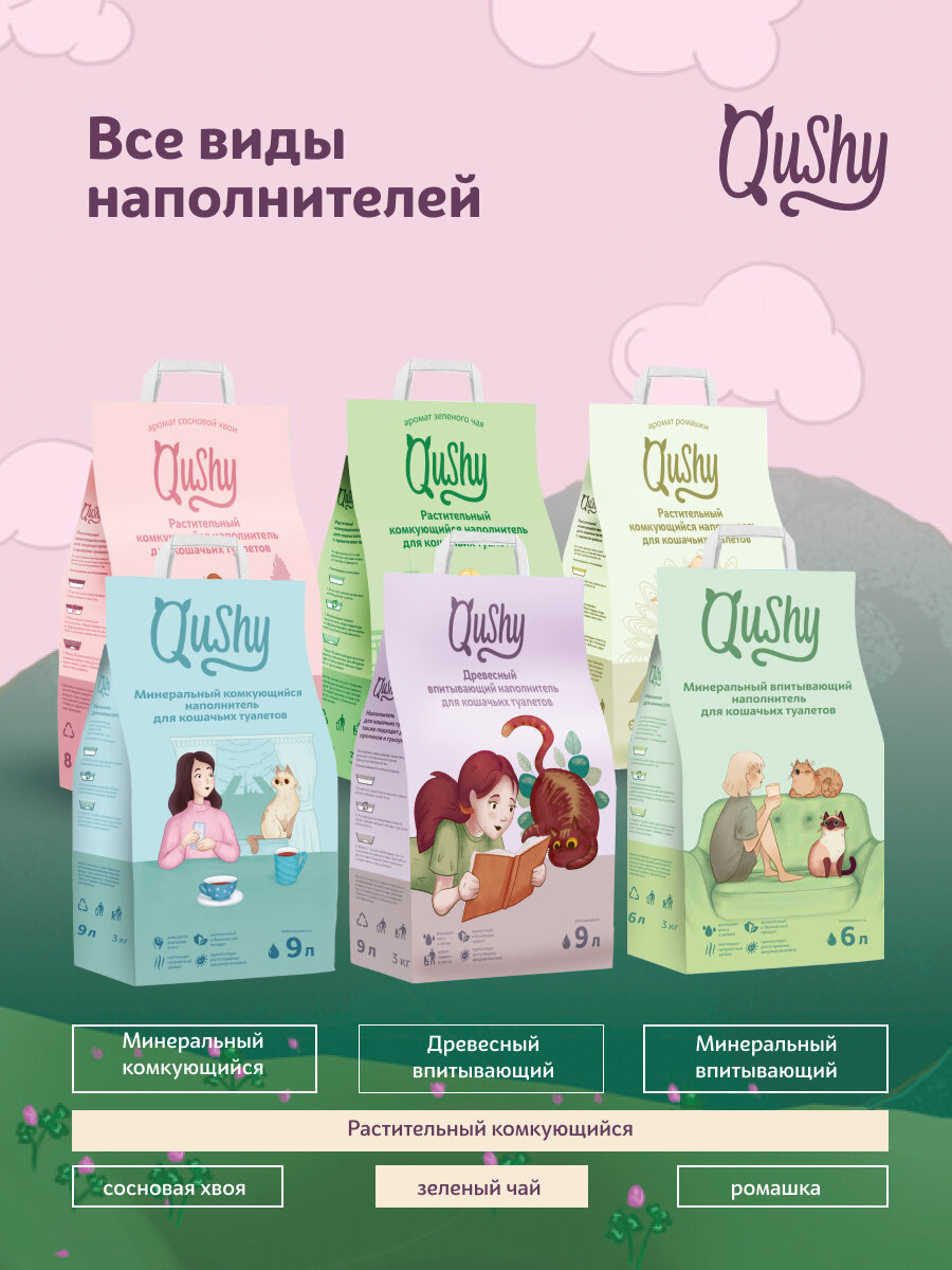 Растительный комкующийся наполнитель для кошачьих туалетов «Qushy» – это 100% натуральный продукт из прессованных древесных волокон.Экологичный подход к гигиене теперь стал ещё удобнее: сформировавшиеся комочки наполнителя можно смывать в унитаз, ведь они безопасны для труб.Эффективно впитывает неприятные запахи и облагает легким натуральным ароматом. И сам наполнитель, и его упаковка могут быть полностью перерабатываемы.Всё это делает «Qushy» экологичным, безопасным и качественным продуктом для вашего питомца.