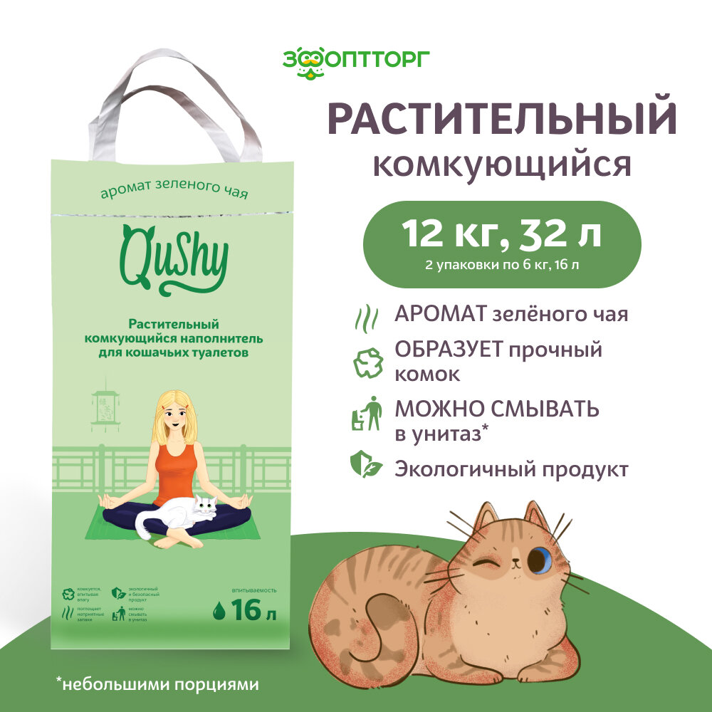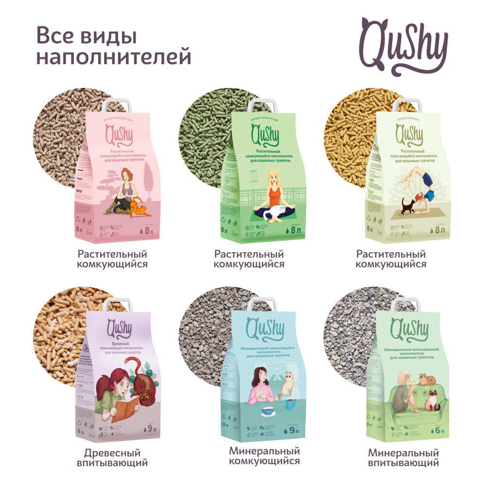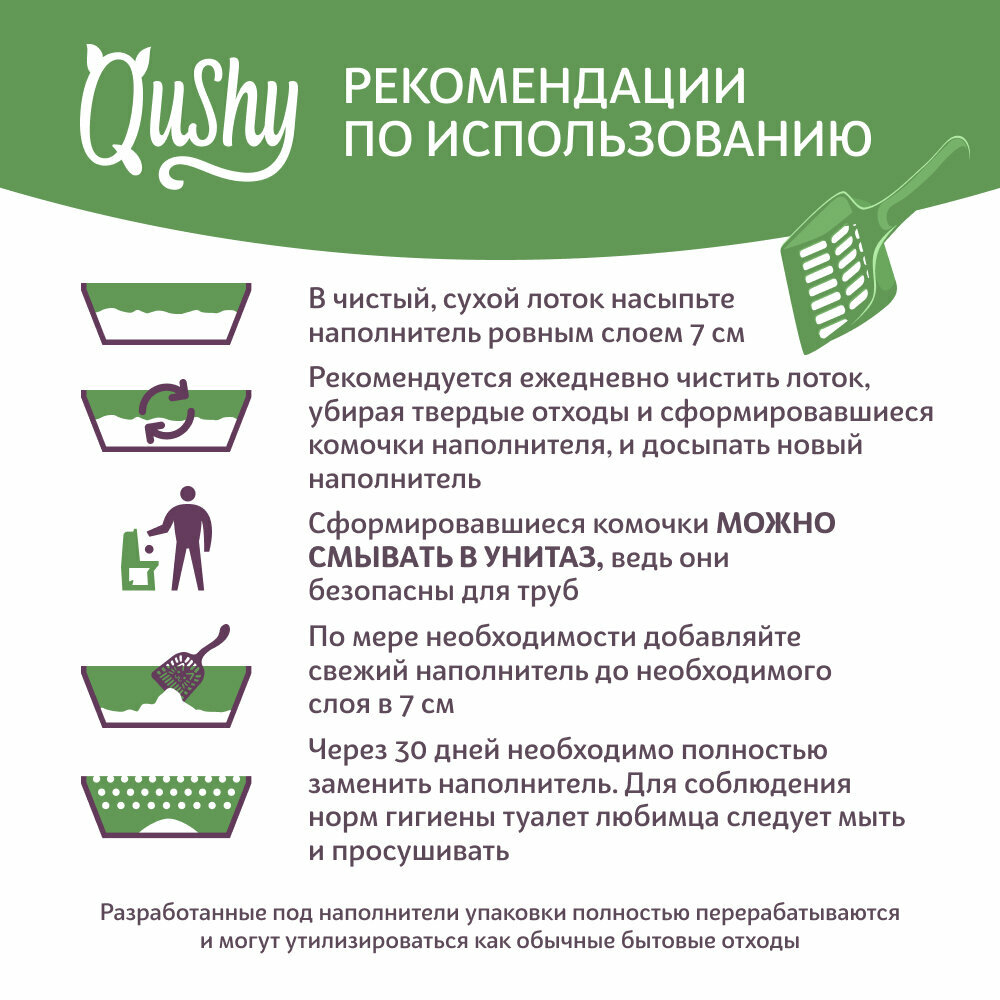 Qushy - линейка натуральных наполнителей для домашних питомцев. Изготовленные из экологически чистых материалов они уже больше года радуют многих питомцев и их хозяев. Высокая впитываемость гарантирует чистоту, сухость и отсутствие запаха.Разработанные под наполнители упаковки полностью перерабатываются и могут утилизироваться как обычные бытовые отходы.Наполнители Qushy (Куши) – это где каждый сможет подобрать, тот самый, наполнитель. В составе линейки: древесный, минеральный комкующийся, минеральный впитывающий и растительные наполнители. Растительный комкующийся наполнитель для кошачьих туалетов «Qushy» – это 100% натуральный продукт из прессованных растительных волокон. Эффективно впитывает неприятные запахи и моментально образует комок в момент соприкосновения с жидкостью. Не пылит и не липнет к лапкам вашего котика. Гранула диаметром 4 мм.Экологичный подход к гигиене теперь стал ещё удобнее: сформировавшиеся комочки наполнителя можно смывать в унитаз.Обладает легким натуральным ароматом Зеленого чая.