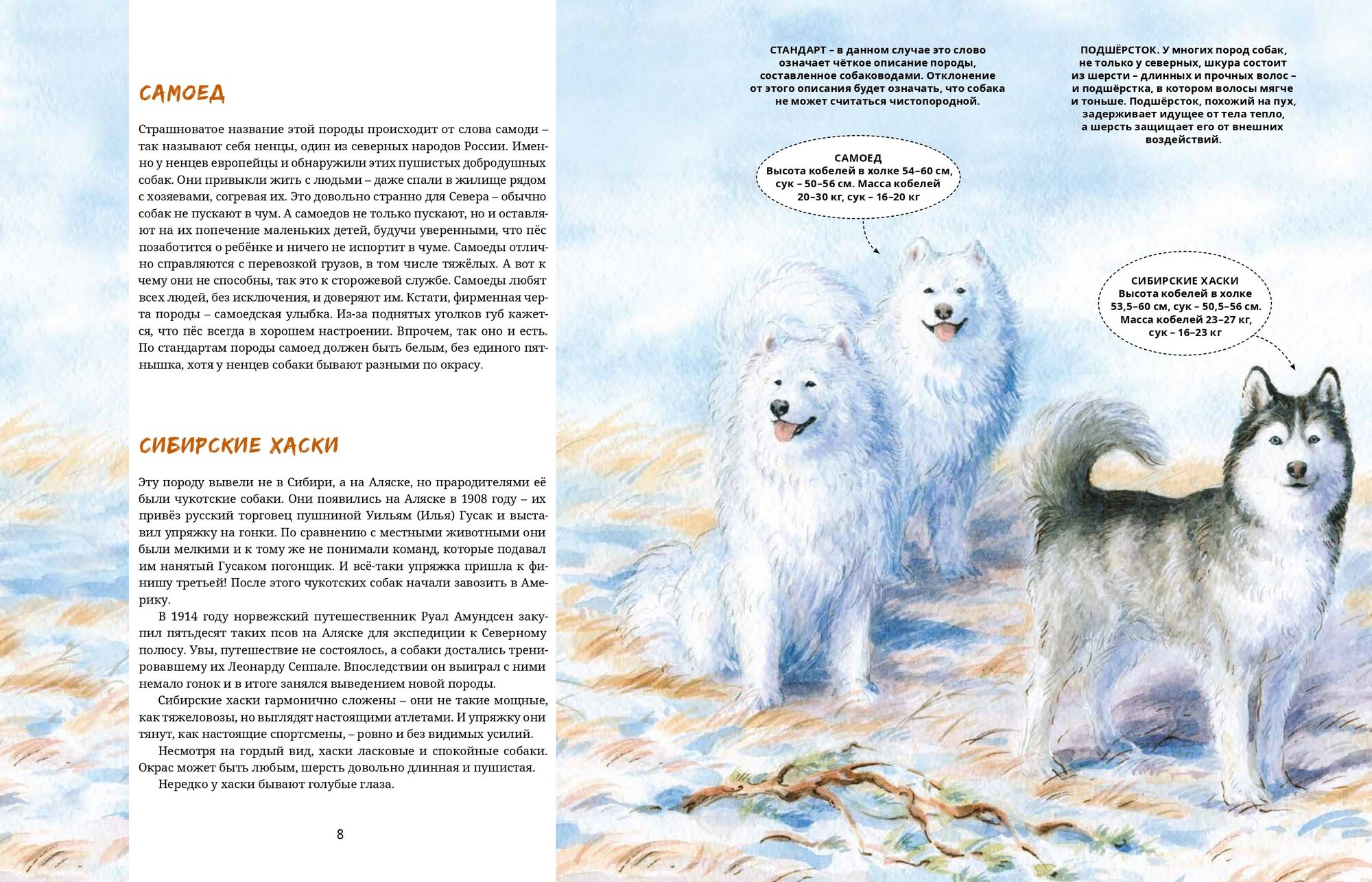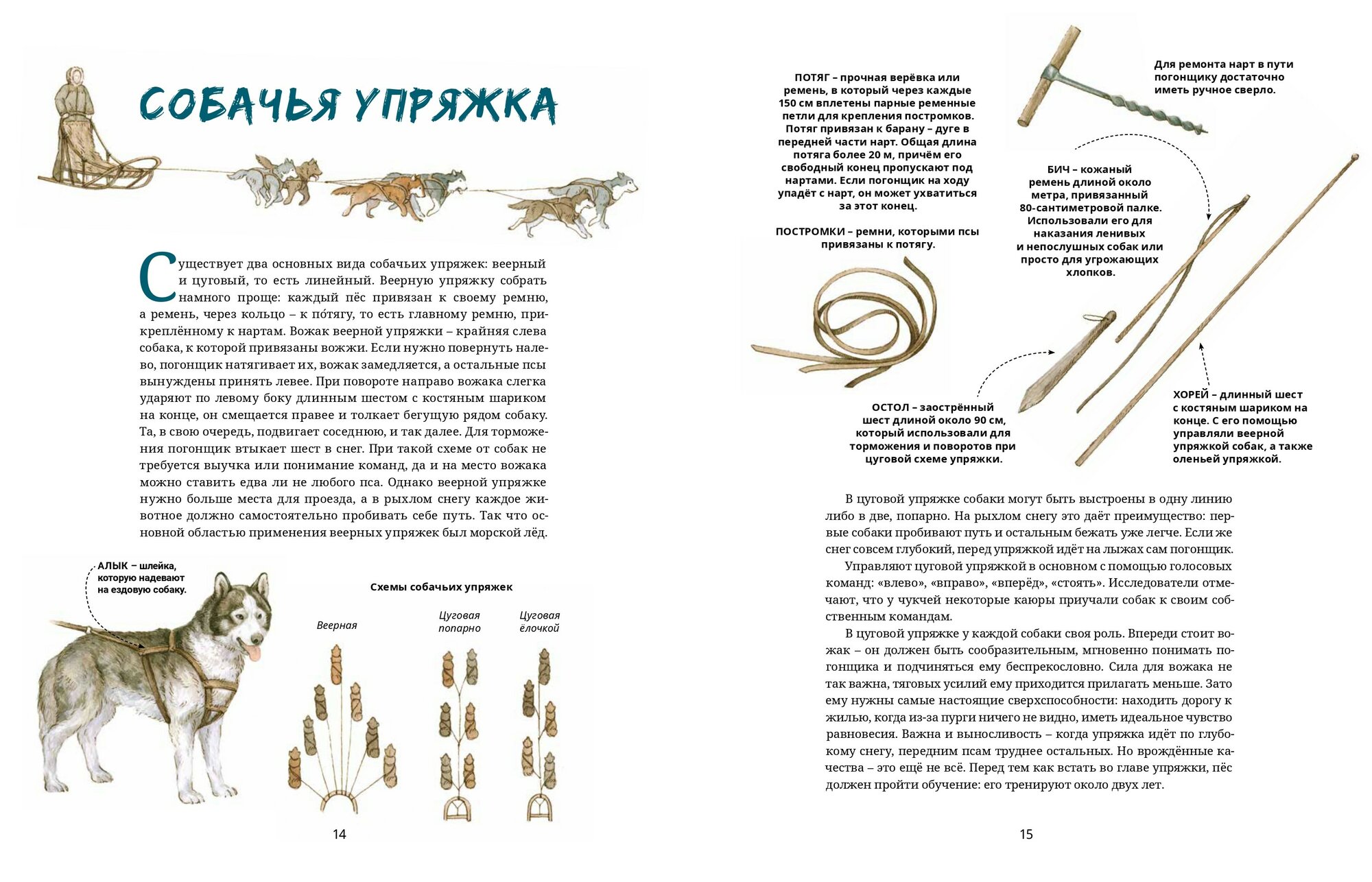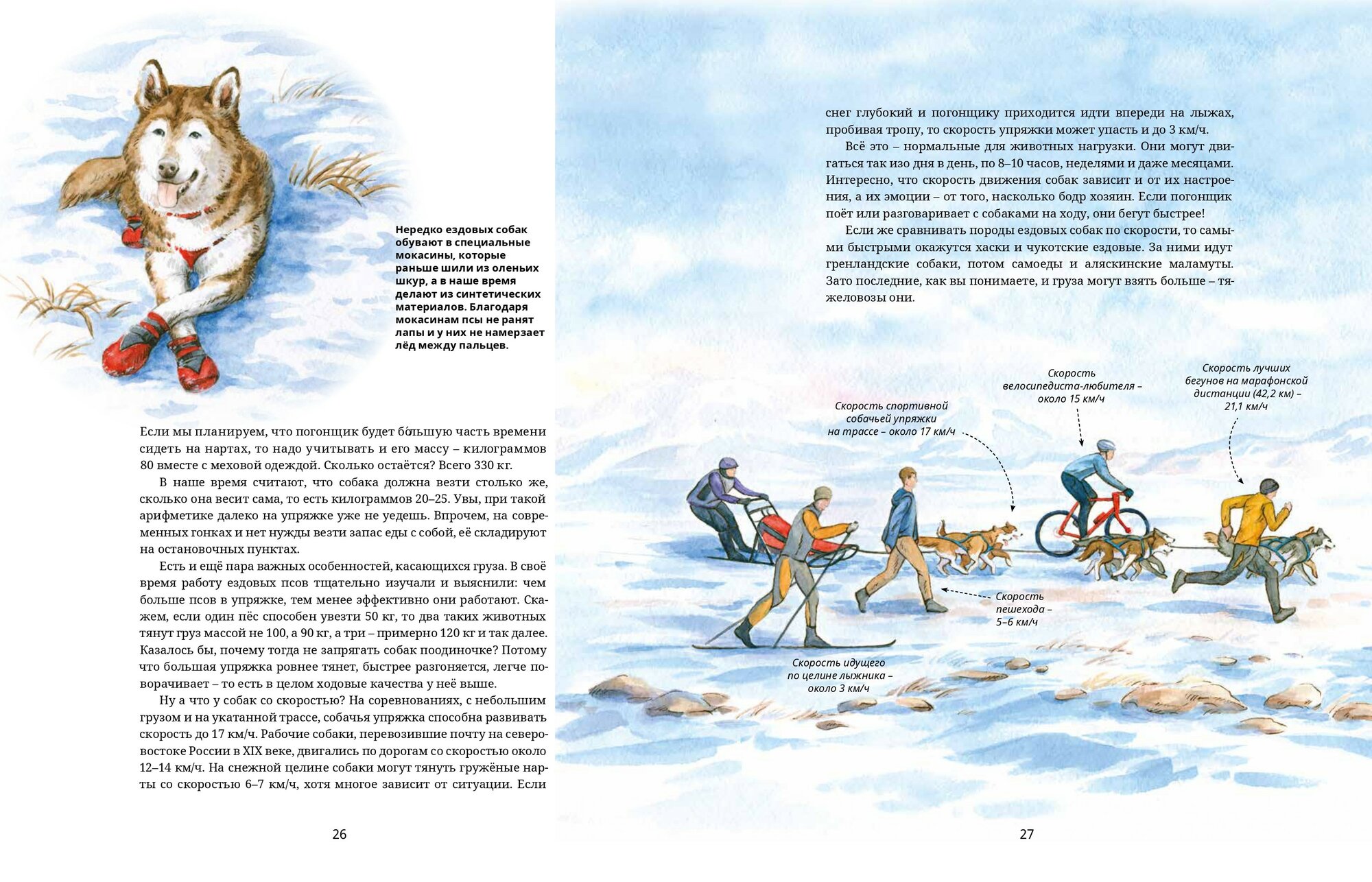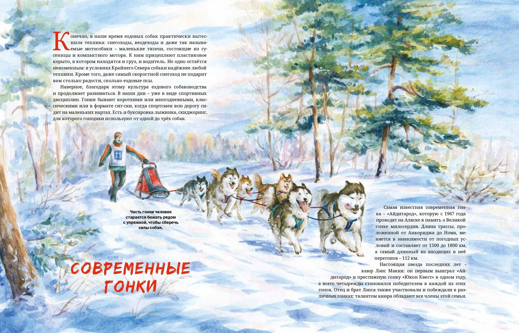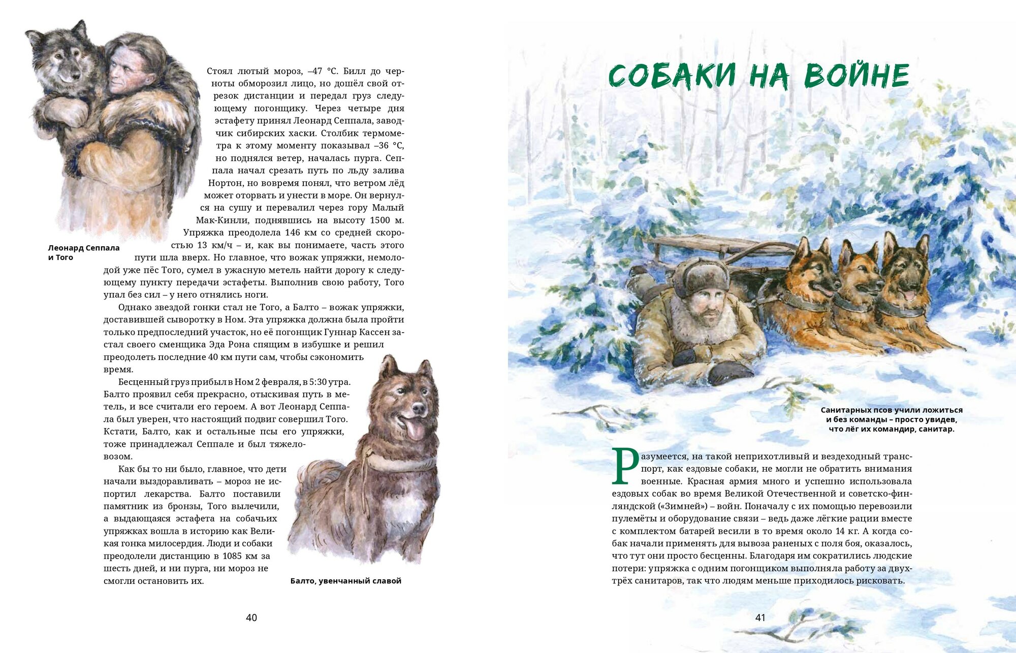 Тут рассказано как собаки стали домашними, какие породы выведены на севере, чем они отличаются. Конечно рассказано как устроена упряжка, как воспитываются и отбираются в нее собаки. А еще рассказано, какую неоценимую помощь оказывали собаки человеку на протяжении истории. Без них не было бы сделано столько георгиафических исследований. О подвигах собак, например о истории, случившейся на Аляске, когда благодаря собакам спасли жизни детей , заболевших дифтерией, упряжки собак доставили лекарства, несмотря на сильнейший холод и большие расстояния.