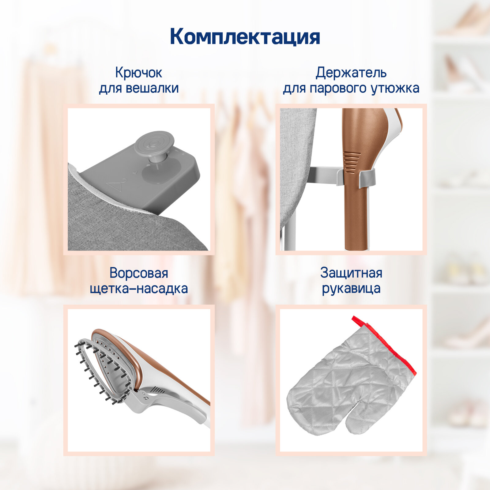 | В комплекте | защитная рукавица, гладильная доска, подставка, держатель утюжка, насадка с ворсовой щеткой, держатель для плечиков, удлиняющий шланг |