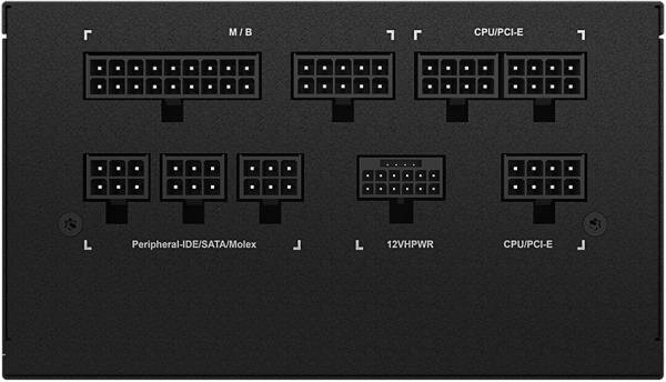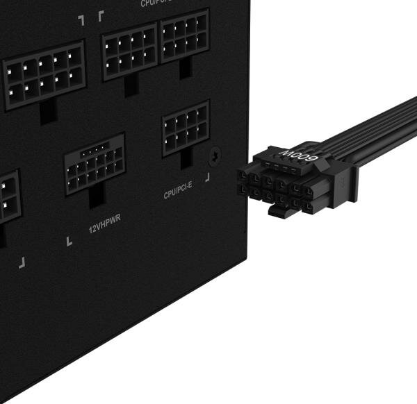 Линии питания +12VHPWR и +12V обеспечивают суммарную выходную мощность 1000 Вт. Выделенная линия питания +12VHPWR предусматривает возможность подключения и гарантированное энергообеспечение графической платы стандарта PCIe Gen 5.0 мощностью до 600 Вт.