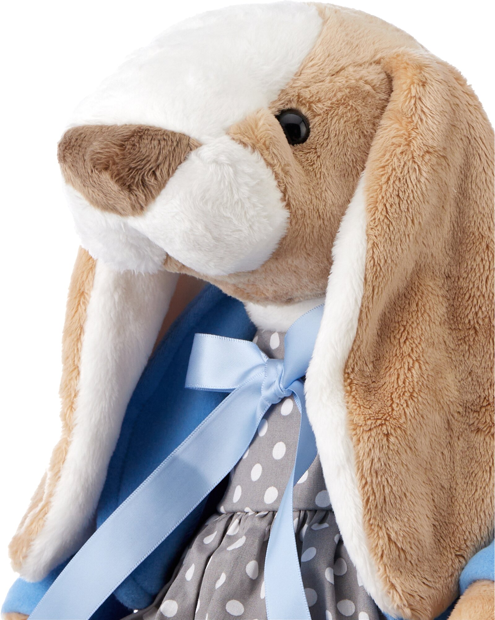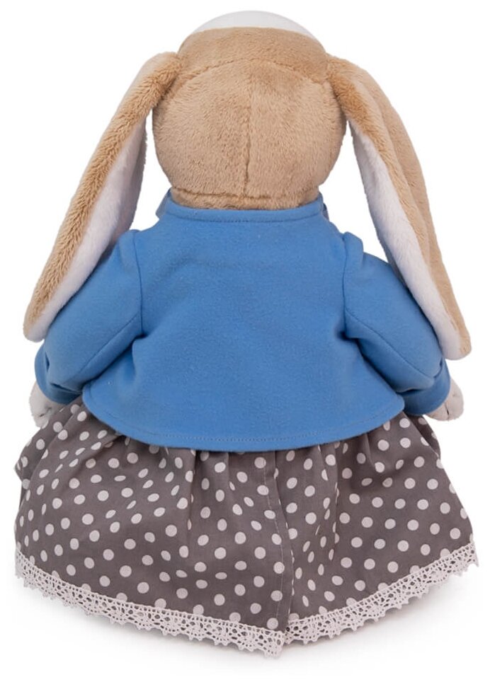Красавица Кики в милом платье из плотного поплина сложного серого цвета в белый горошек. Платье украшено атласным бантом цвета голубого льда и белоснежным кружевом по подолу. Также в комплекте мягкий жакет из флиса цвета синей гавани.