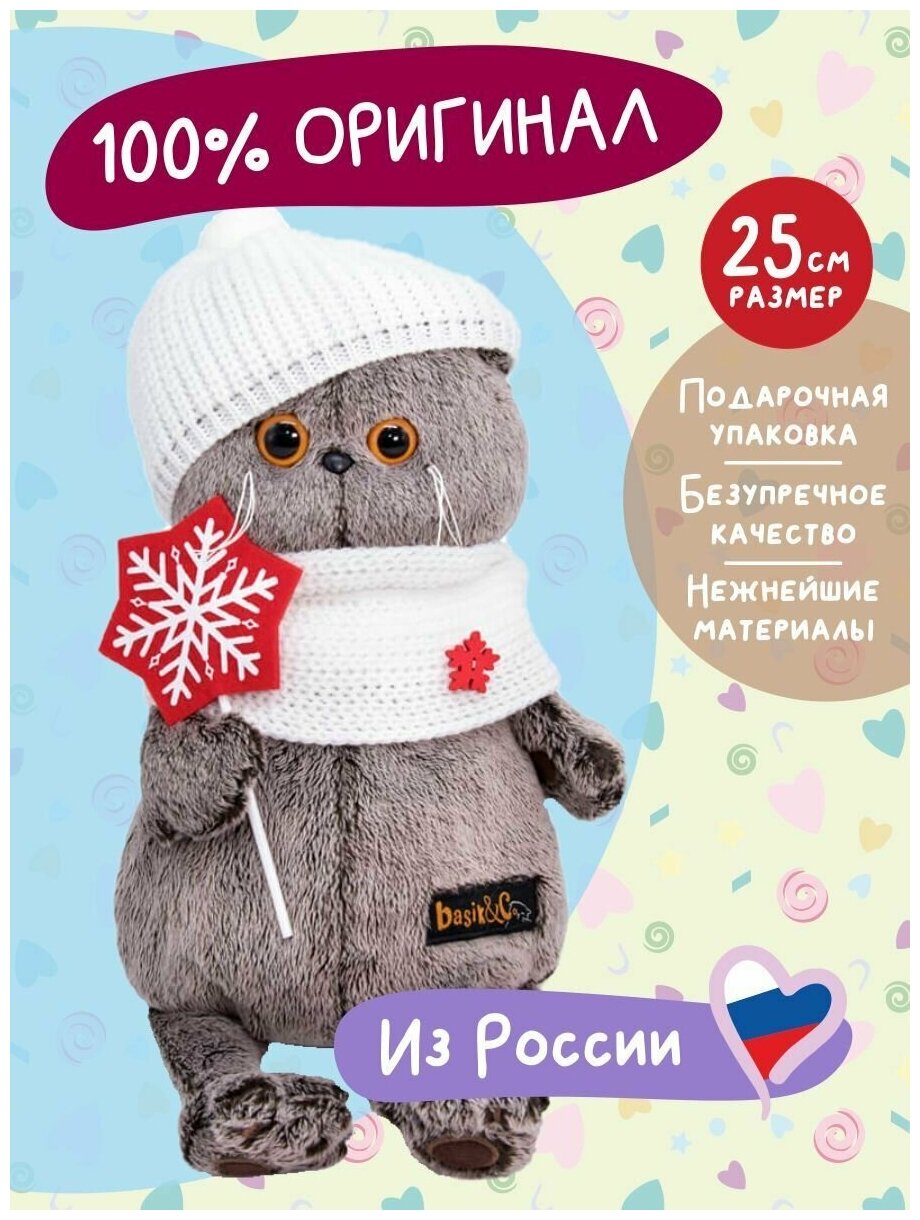 Кот Басик в милом вязаном комплекте - белоснежном снуде и шапочке с помпоном. Снуд украшен деревянной красной снежинкой. В лапках Басик держит красную звездочку из фетра с белой снежинкой на палочке.