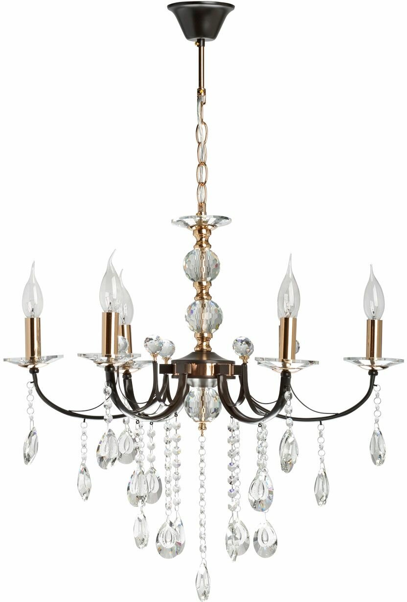 Металлическое основание подвесного светильника окрашено в цвет кофе. Отдельные элементы основания гальванизированы в цвет золота. Светильник декорирован прозрачным хрусталем.