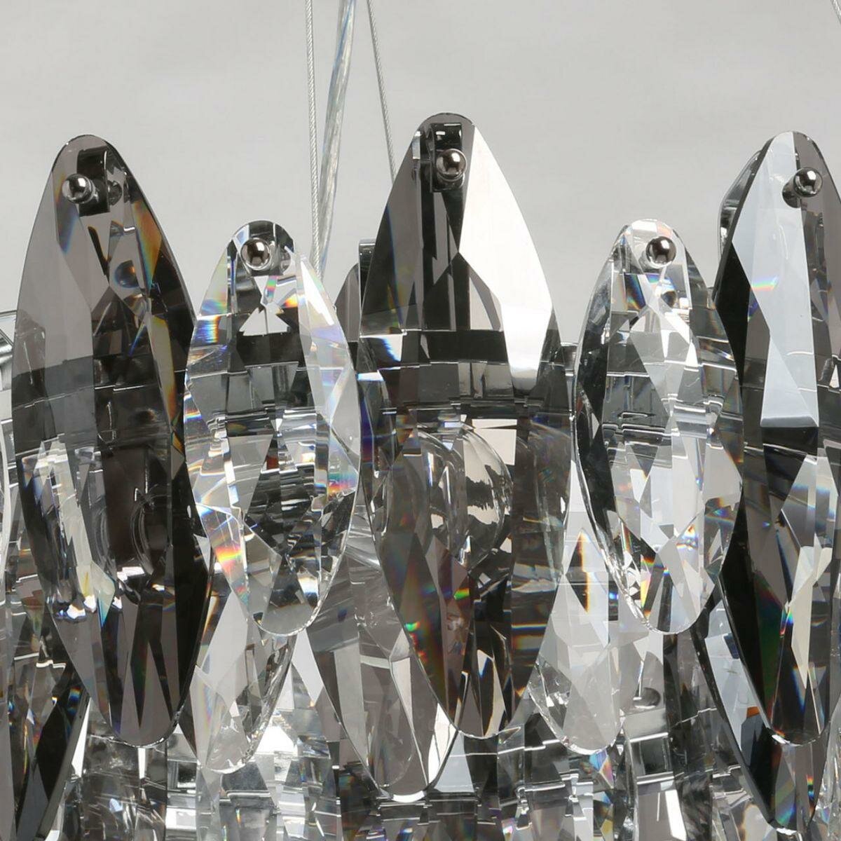 Металлическое основание светильника гальванизировано в цвет хрома. Светильник декорирован хрусталем оригинальной формы со сложной огранкой прозрачного и дымчатого цвета.