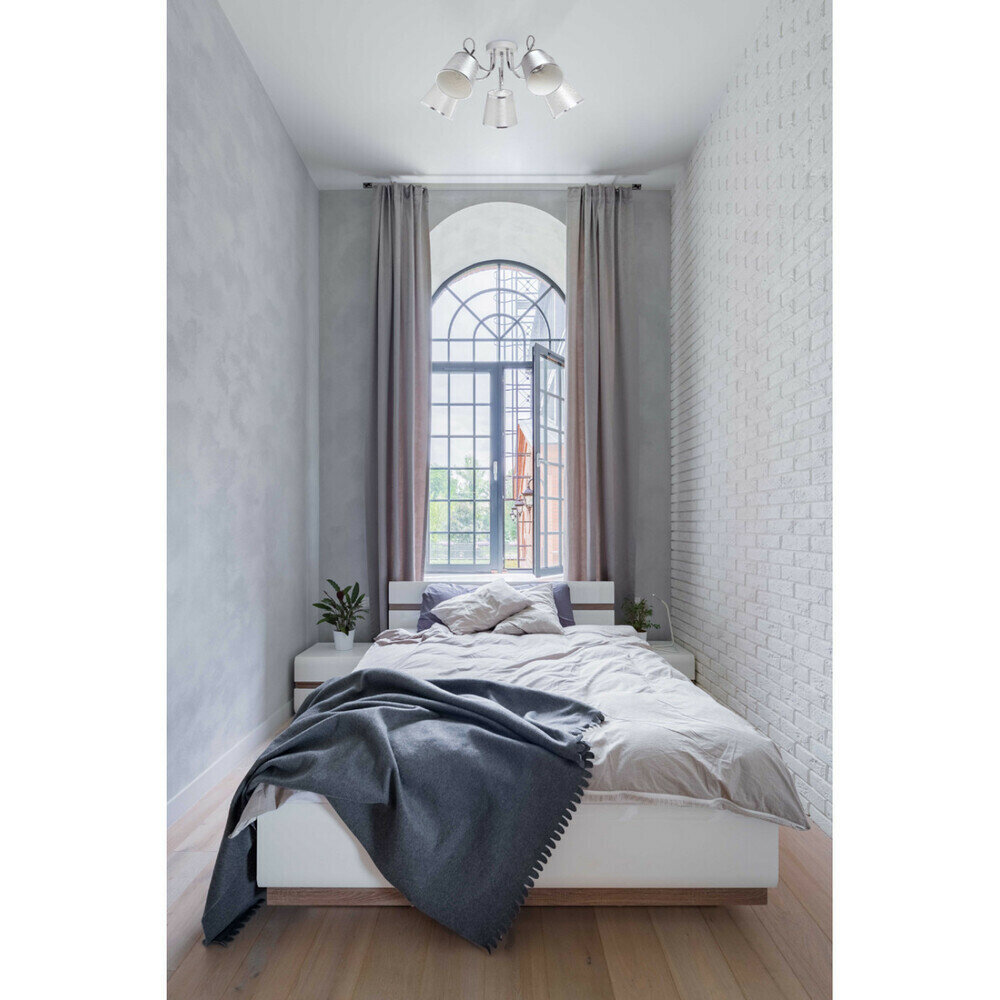 Металлическое основание потолочного светильника гальванизировано в цвет хрома. Отдельные элементы окрашены в белый цвет. Двухслойные текстильные абажуры выполнены из белого текстиля с геометрическим рисунком и термостойкого прозрачного акрила с внутренней стороны.