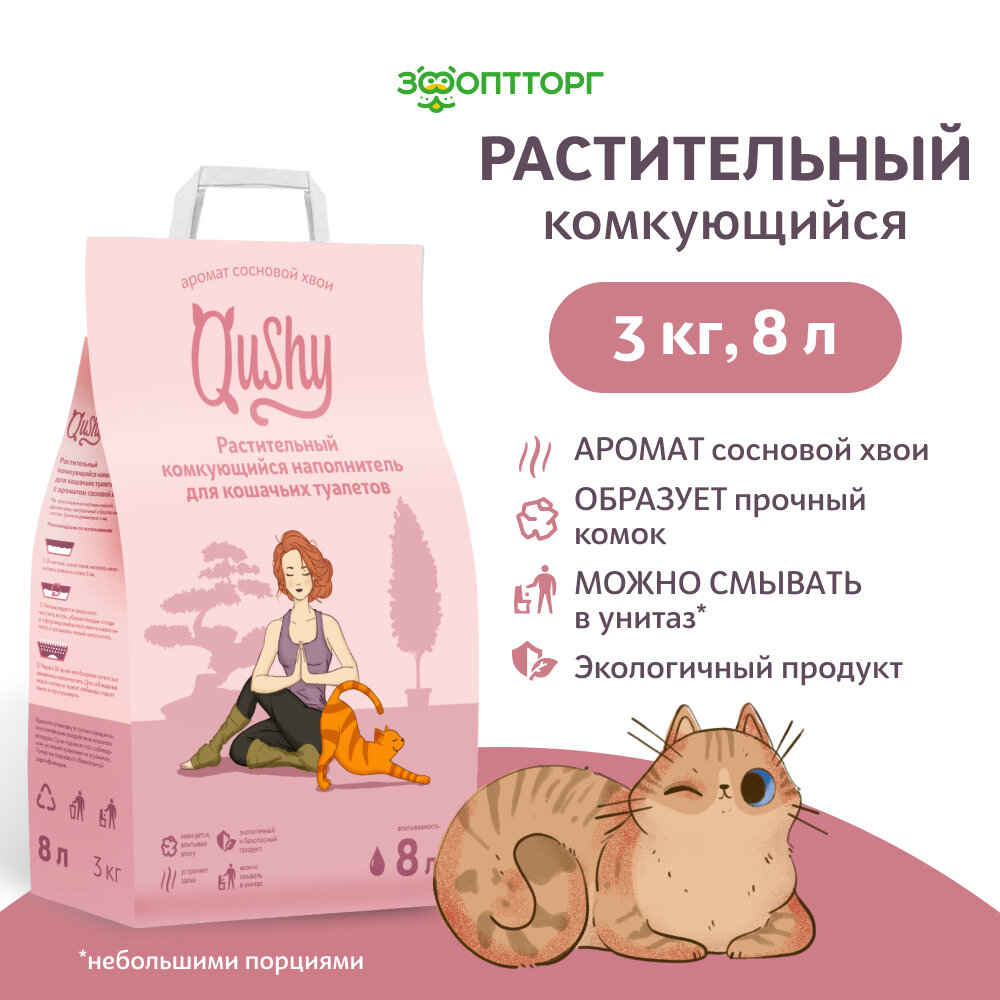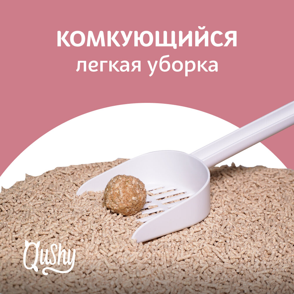 Растительный комкующийся наполнитель для кошачьих туалетов «Qushy» – это 100% натуральный продукт из прессованных древесных волокон.Экологичный подход к гигиене теперь стал ещё удобнее: сформировавшиеся комочки наполнителя можно смывать в унитаз, ведь они безопасны для труб.Эффективно впитывает неприятные запахи и облагает легким натуральным ароматом. И сам наполнитель, и его упаковка могут быть полностью перерабатываемы.Всё это делает «Qushy» экологичным, безопасным и качественным продуктом для вашего питомца.