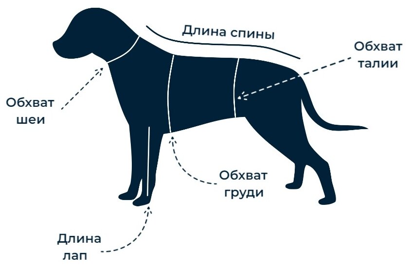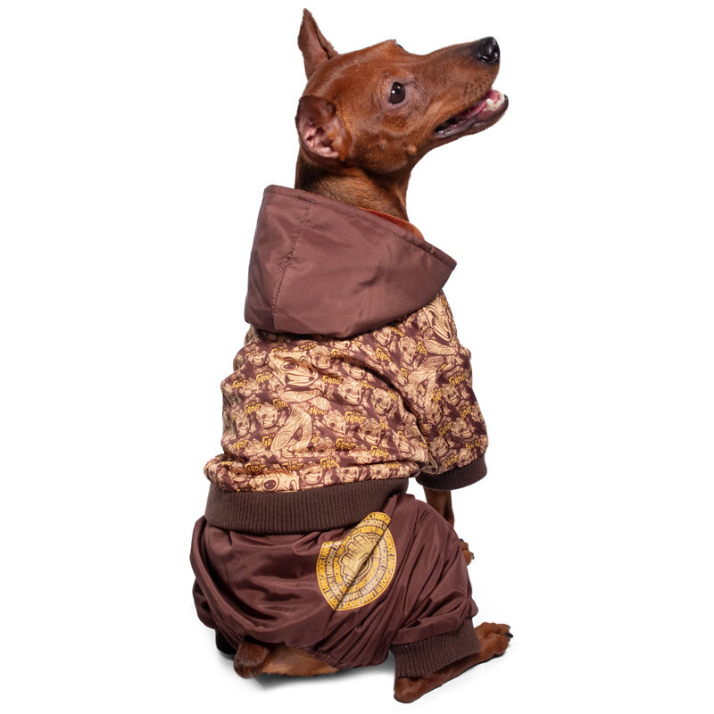 Застегивается на кнопки на груди, пах открыт, комбинезон закрывает тело животного, защищая его от намокания и замерзания. Капюшон по размеру для любителей комфорта.