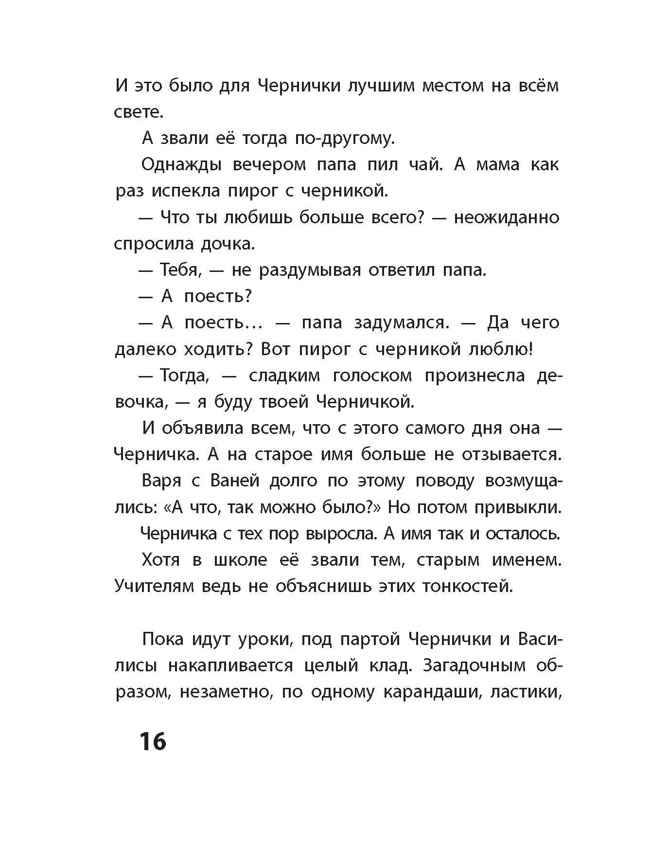 А на каникулах и вовсе начинается веселье! За три летних месяца Черничка становится героиней сельской легенды, запутанного детектива и настоящей истории с привидениями. Задорная и любопытная девчонка везде находит приключения и новых друзей.