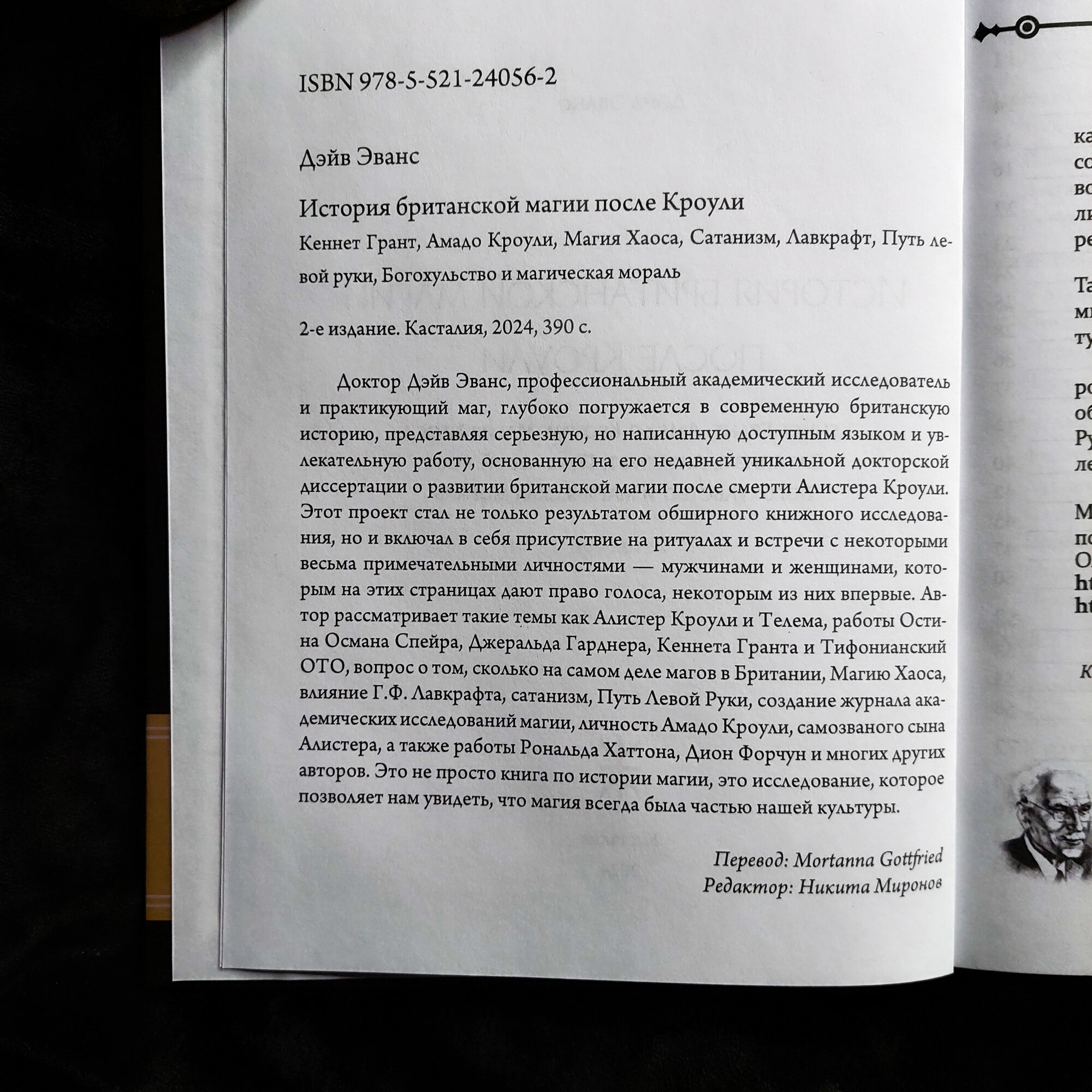 Доктор Дэйв Эванс, профессиональный академический исследователь и практикующий маг, глубоко погружается в современную британскую историю, представляя серьезную, но написанную доступным языком и увлекательную работу, основанную на его недавней уникальной докторской диссертации о развитии британской магии после смерти Алистера Кроули. Этот проект стал не только результатом обширного книжного исследования, но и включал в себя присутствие на ритуалах и встречи с некоторыми весьма примечательными личностями – мужчинами и женщинами, которым на этих страницах дают право голоса, некоторым из них впервые. Автор рассматривает такие темы как Алистер Кроули и Телема, работы Остина Османа Спейра, Джеральда Гарднера, Кеннета Гранта и Тифонианский ОТО, вопрос о том, сколько на самом деле магов в Британии, Магию Хаоса, влияние Г.Ф. Лавкрафта, сатанизм, Путь Левой Руки, создание журнала академических исследований магии, личность Амадо Кроули, самозваного сына Алистера, а также работы Рональда Хаттона, Дион Форчун и многих других авторов. Это не просто книга по истории магии, это исследование, которое позволяет нам увидеть, что магия всегда была частью нашей культуры.