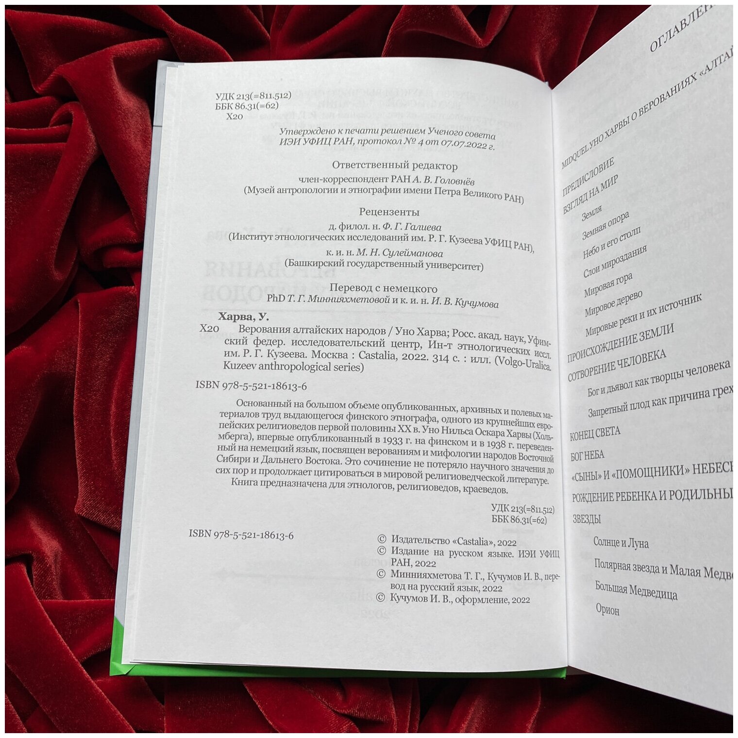 Фундаментальный труд финского исследователя, который является чуть ли не всеобъемлющим описанием взглядов алтайских народов на происхождение Вселенной, человека и всего, что есть на Земле. Подробно описаны религия, шаманизм и погребальные обряды. Это не совсем развлекательное чтение, поскольку автор являлся крупнейшим этнографом и религиоведом своего времени. В книге очень много ссылок на труды его предшественников и современников. В книге нет ярких иллюстраций, но она стоит того, чтобы ее купить и прочитать. Хотя бы ради того, чтобы знать о народах нашей страны немного больше.