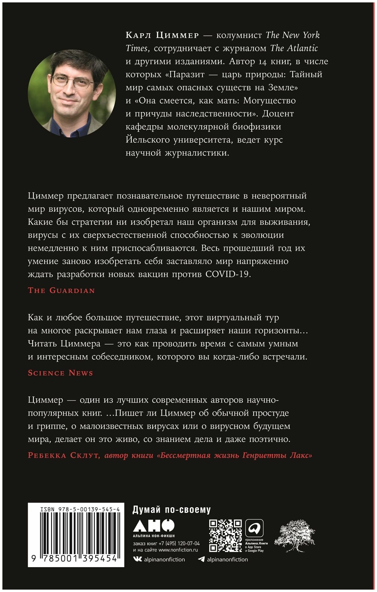 Вирусы — неотъемлемая часть нашей жизни. Это не просто наши соседи, непрошеные жильцы в наших телах, источник множества разных болезней, угроза страшных эпидемий. Книга показывает их нам во всем многообразии, помогает понять их природу и вооружает знаниями, особенно полезными в эпоху ковида. Приятным сюрпризом для меня оказалось то, что неопасные вирусные заболевания тренируют наш иммунитет, оберегая от более серьезных нарушений. Убедительно звучат аргументы в пользу вакцинации против гриппа и папилломавируса. Легкий стиль изложения, мастерское использование метафор, множество интересных фактов характерны для Карла Циммера, и эта его книга не исключение.