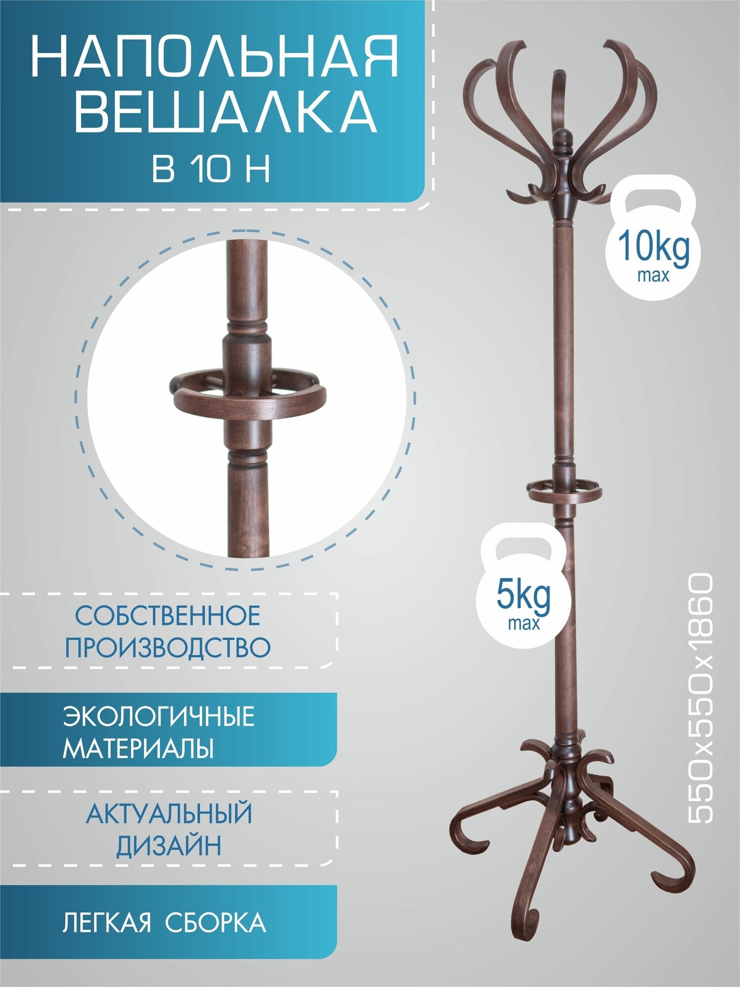 Вешалка В10Н – оптимальный выбор десятков тысяч покупателей. Если у вас возникла потребность в организации места хранения верхней одежды, и вы подбираете вешалку в классическом стиле, то В10Н – эта та вешалка, которую вы искали. Классическая элегантная вешалка для верхней одежды из массива натурального дерева в кабинет, приемную, офис, кафе. Очень часто эту вешалку используют и в домашних интерьерах - в прихожих, домашних кабинетах и даже в спальнях. Вешалка оснащена пятью крючками для верхней одежды, пятью крючками для головных уборов. Крючки и опоры вешалки изготовлены по технологии гнуто-клееного шпона и выдерживают значительные нагрузки, что обеспечивает долгий срок службы вешалки. Кроме того в сумочной зоне есть четыре крючка для сумок и зонтов. Массив дерева – универсальный и привычный материал в мебели, за счет своих свойств элементы интерьера из натурального дерева всегда уместны в обстановке. Вешалка компактно упакована и для ее транспортировки не требуется прибегать к помощи грузового такси, ее можно транспортировать даже в общественном транспорте. При этом она легко собирается – все элементы просто скручиваются между собой. За счет разноса опор вешалка устойчива, а толщина крючков позволяет уверенно пользоваться вешалкой даже в заведениях с большой проходимостью.Вешалка В10Н – рациональный выбор для тех, кто предпочитает предметы интерьера из натуральных материалов в классическом стиле.