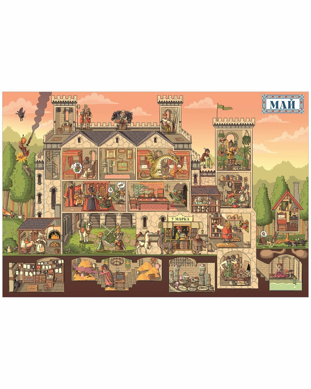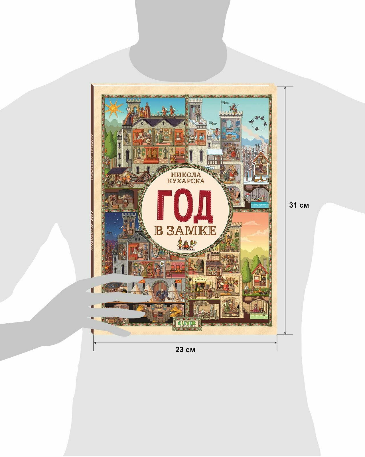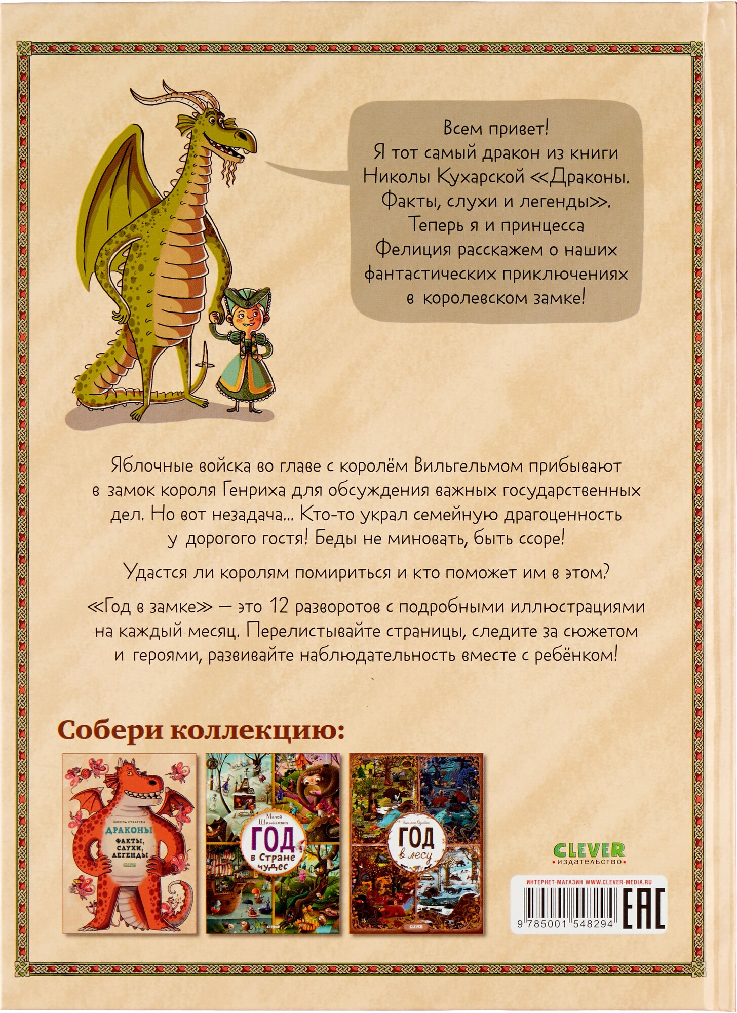 «Год в замке» — это книга-гляделка о временах года в одной волшебной стране. Каждый из 12 разворотов рассказывает, как живут и чем занимаются обитатели королевского замка в том или ином месяце. Внимательно рассматривайте картинки и шаг за шагом распутывайте цепочку таинственных событий, в которых не обошлось без героя другой книги автора — «Драконы. Факты, слухи и легенды».