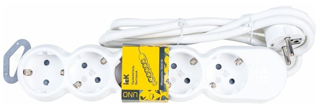 | Прочие особенности и свойства | Бытовые удлинители серии UNO IEK предназначены для подключения к стационарным розеткам одного или нескольких электроприборов, оснащённых электрическими вилками., Одна из розеток развернута на 90° для удобного подключения электроприборов., Держатель на корпусе позволяет крепить удлинитель на вертикальных поверхностях. |