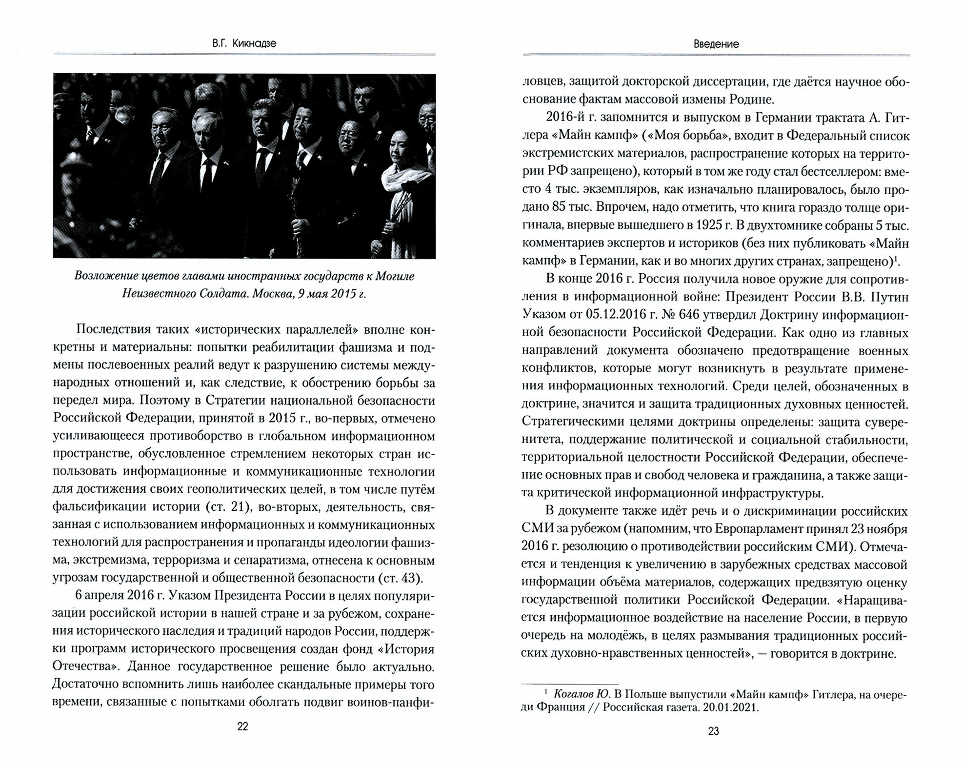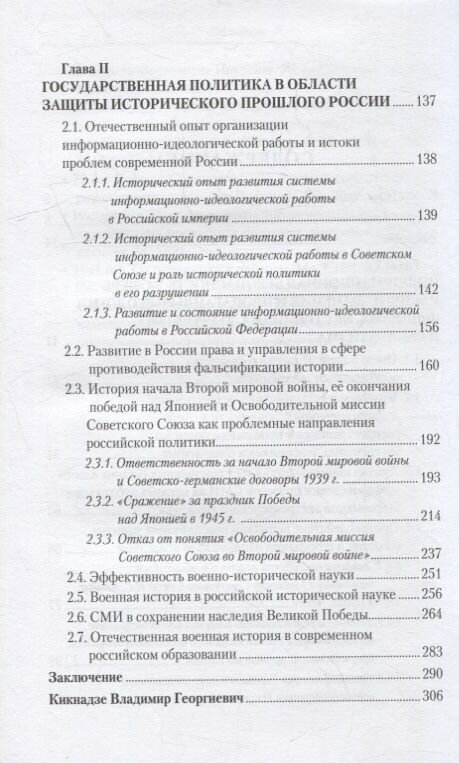 Книга рассказывает об эволюции государственной политики России в двух взаимосвязанных направлениях: сохранение исторической памяти и информационная безопасность, нацеленная на предотвращение пропаганды идеологий фашизма, экстремизма, терроризма и сепаратизма. Ключевое внимание уделено вопросам государственной политики по противодействию искажениям истории в ущерб интересам России. Сегодня это является одним из наиболее важных факторов обеспечения информационной безопасности российских граждан. В научно-популярной форме даны ответы на актуальные вопросы истории Второй мировой войны, которые наиболее часто подвергаются медийным атакам. Известный историк В.Г. Кикнадзе не просто исследует эти явления, но и дает собственные рекомендации по совершенствованию государственной политики в этой сфере.