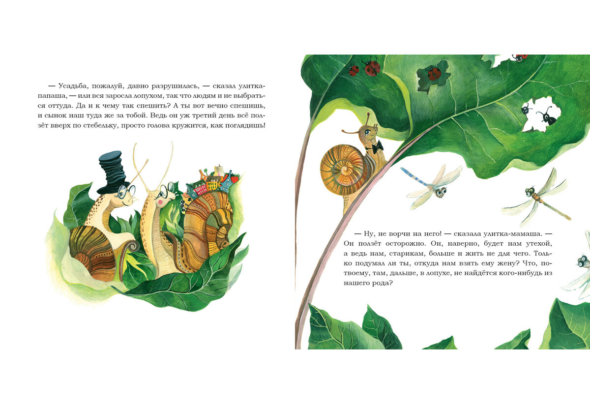 Оформление книги прекрасное. Улитки каковы! Дина Леонова учла особенности костюмов того времени. Понравилось, что на титульном листе название выполнено авторским шрифтом. И замечательный форзац.