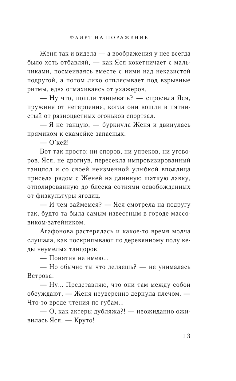 Если хочется провести вечер с яркими и харизматичными персонажами, то “Флирт на поражение” – лучший выбор! Книга мгновенно поднимает настроение. Женя Агафонова и Ярослава Ветрова – давние подруги, но трудно представить настолько разных людей. Женя работает в библиотеке и проводит партии по настольной ролевой игре, а Ярослава – успешный бьюти-блогер и очень ухоженная девушка. У Жени не так чтобы клеится с противоположным полом, поэтому Ярослава, заметив интерес подруги к одному из посетителей библиотеки, решает помочь и устроить им свидание. Но это скорее разъединило подруг, а не объединило. И Женя решает доказать, что в первую очередь важна не внешность, а интеллект. Конечно же, подруги не смогут долго друг без друга, но встретятся после разлуки они уже совершенно другими людьми. Мне кажется, эта книга больше про дружбу, нежели про любовь, хотя романтики и влюбленностей в ней хватает.