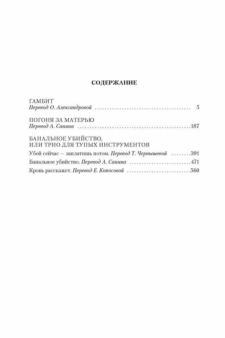 Кроме романов "Гамбит" и "Погоня за матерью", в книгу вошли три повести, в которых Вулф принимается за расследование, чтобы доказать невиновность чистильщика обуви, снять обвинения с Арчи, которого подставила его знакомая, а заодно в очередной раз сказать полиции, что она идет по неверному следу.