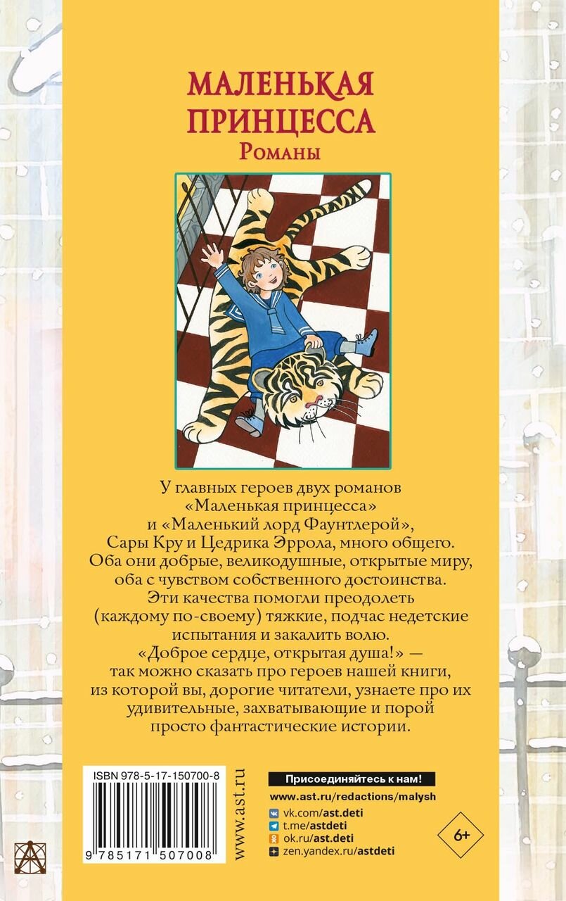 В нашу книгу "Маленькая принцесса. Романы" вошли два произведения "Маленькая принцесса" и "Маленький лорд Фаунтлерой". Впервые оба они были опубликованы почти одновременно: первый в 1886 г., второй - в 1888 г., и оба сразу стали бестселлерами и уже более ста лет это классика детской мировой литературы.
