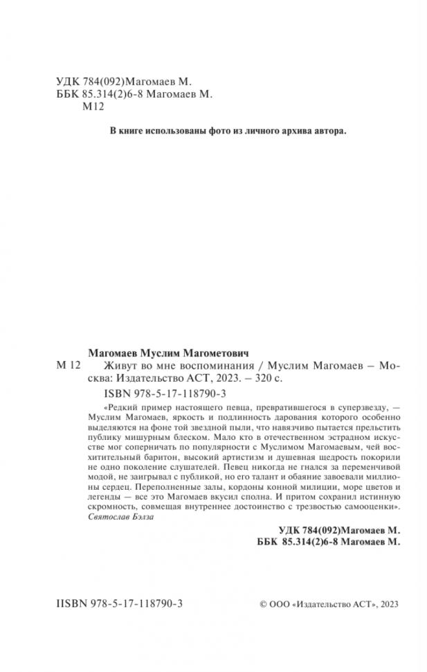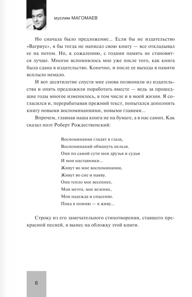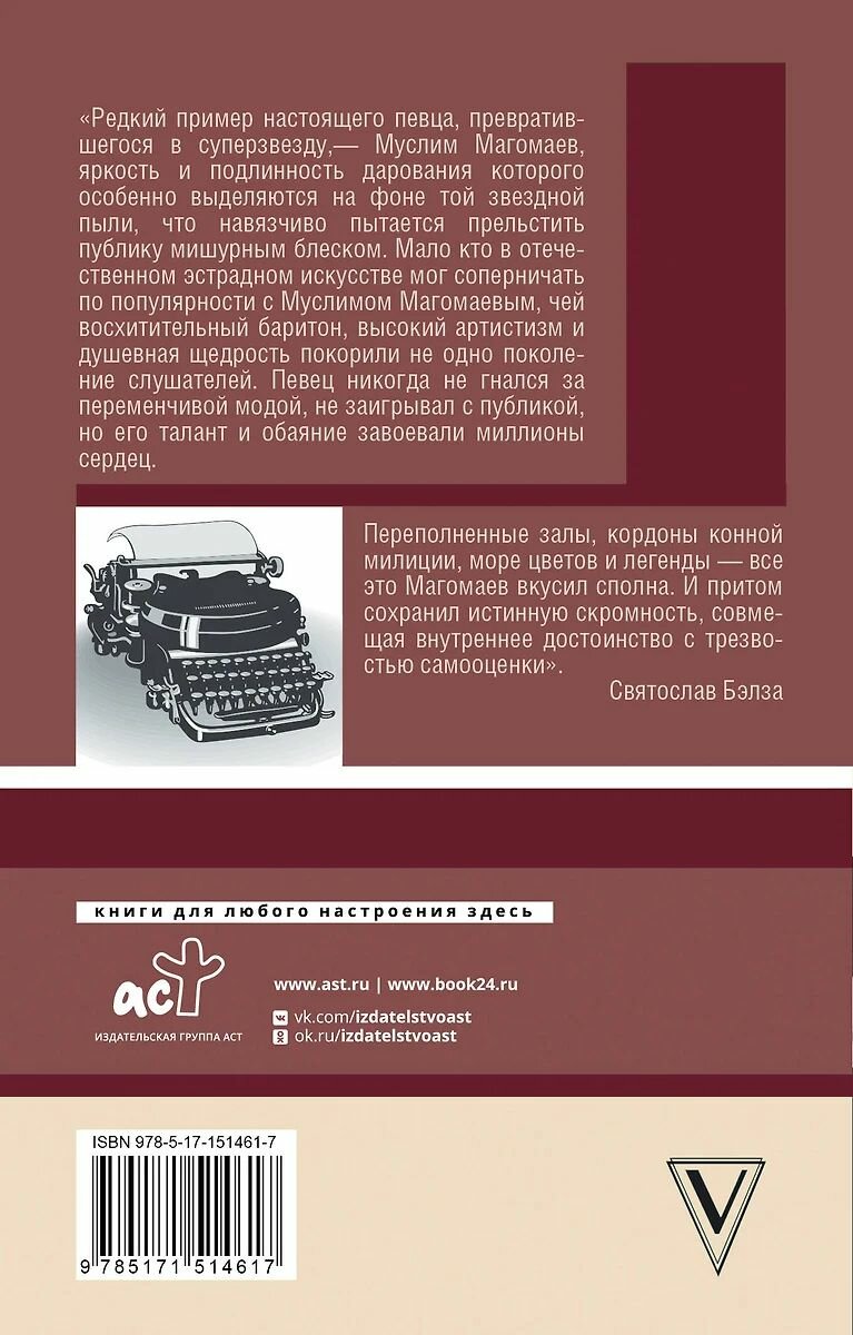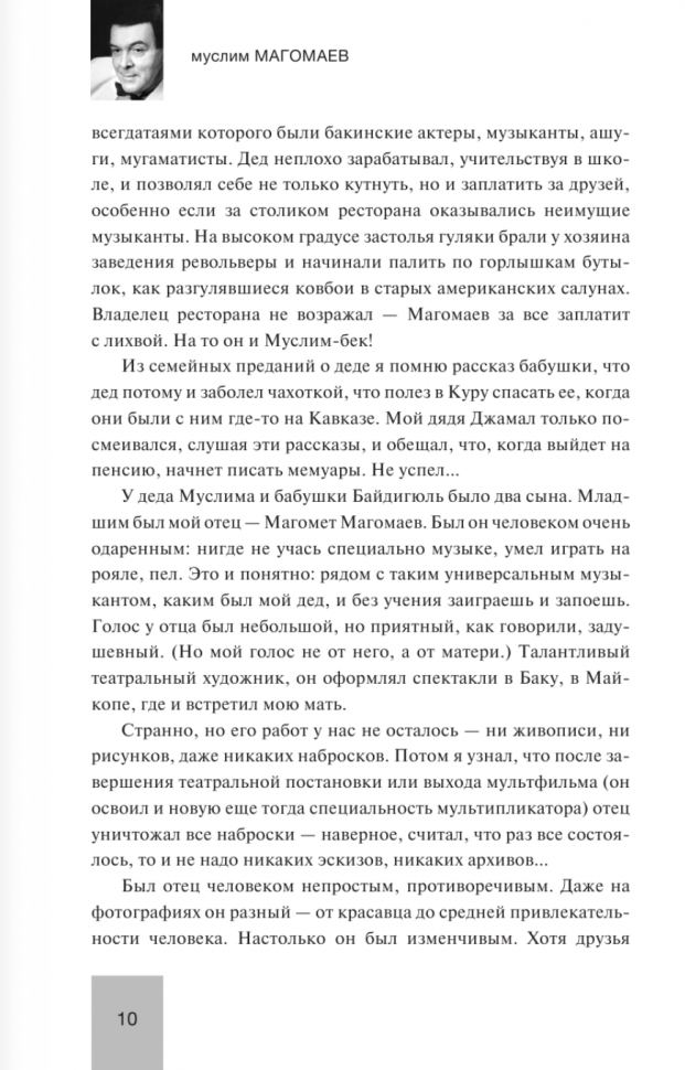Впервые купила книгу о таком великом певце, как Муслим Магамаев и очень довольна. Прочитала с большим удовольствием и думаю, что надо больше издавать книг о наших артистах. В книге симбиоз воспоминаний Муслима и комментарии редакторов. Единственный недостаток по моему мало фотографий