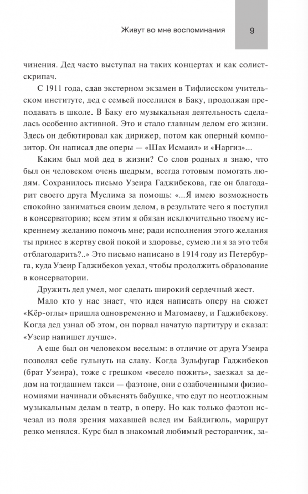 Очень люблю читать биографии о знаменитых людях, но предпочитаю АВТОбиографии. Заказала онлайн эту книгу. По всем параметрам: виду, по названию, по имени автора - это должна быть АВТОбиография. Но как же я разочаровалась - книга состоит из отдельных ЦИТАТ настоящей книги "Живут во мне воспоминания". тЕКСТ СОСТАВЛЕН СЛЕДУЮЩИМ ОБРАЗОМ-Приводится цитата из настоящей книги Магомаева, несколько предложений, а остальное, на три-пять страниц, пояснения о нем в третьем лице: "Муслим сделал то-то, Муслим подумал то-то". Поначалу думала, что это вводная часть, типа предисловия, но нет, так построеная вся книга. Стала рассматривать выходные данные - нигде не указан автор этих "художественных" обработок! НО- перед оглавлением есть скромная страничка, где сказано: "Использованы цитаты из: книги "Живут во мне воспоминания", фильма такого-то, телепередач таких-то и различных интервью"! Какое разочарование! Если бы я покупала в магазине, то, наверное, бы поняла, что это вольный пересказ, а так, при покупке онлайн, этого не поймешь. В общем, не советую именно эту книгу для покупки. Решила, что сдам этот опус в бук-кроссинг, а себе постараюсь найти настоящую книгу Магомаева.